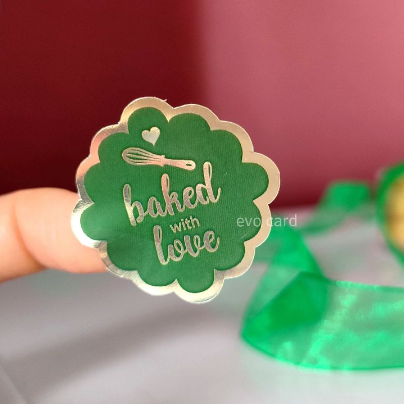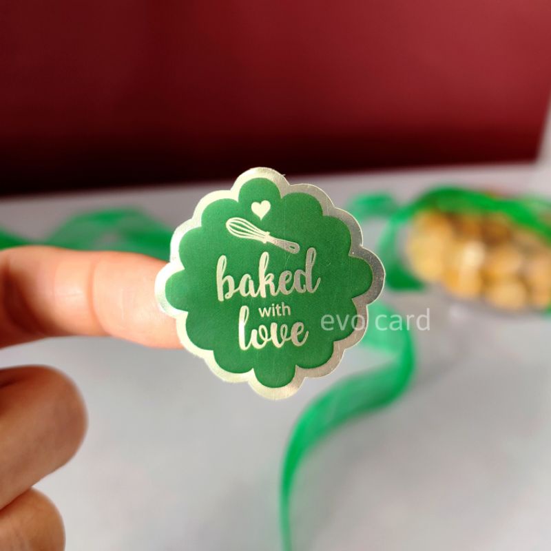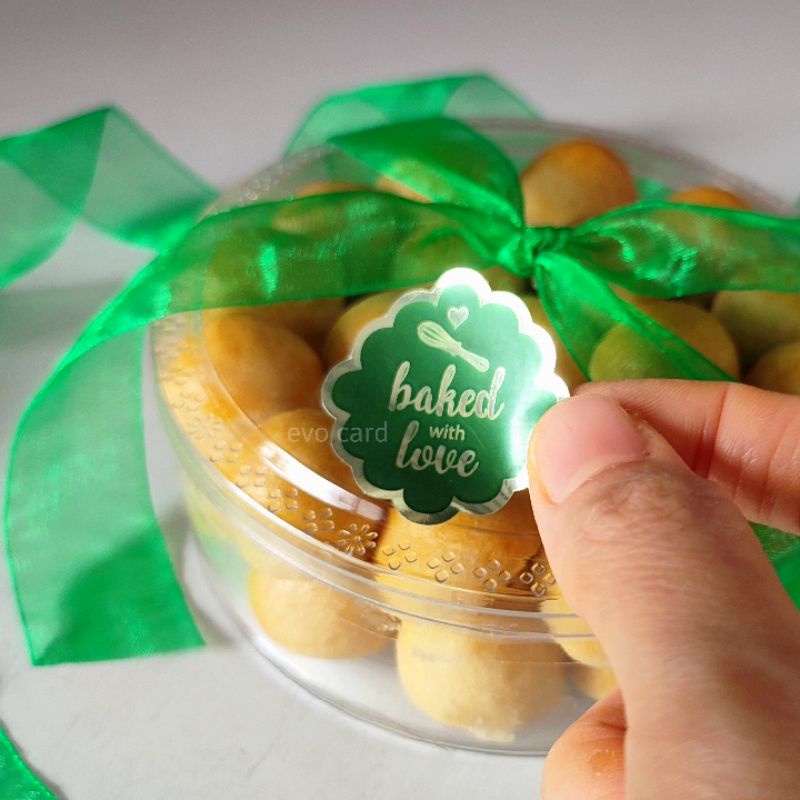 Sticker label produk makanan baked with love | warna hijau tulisan gold unik | stiker kue kering