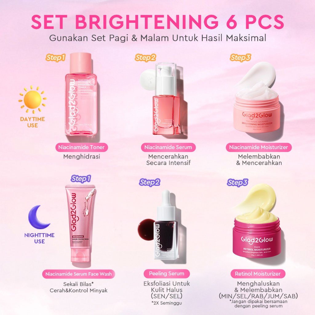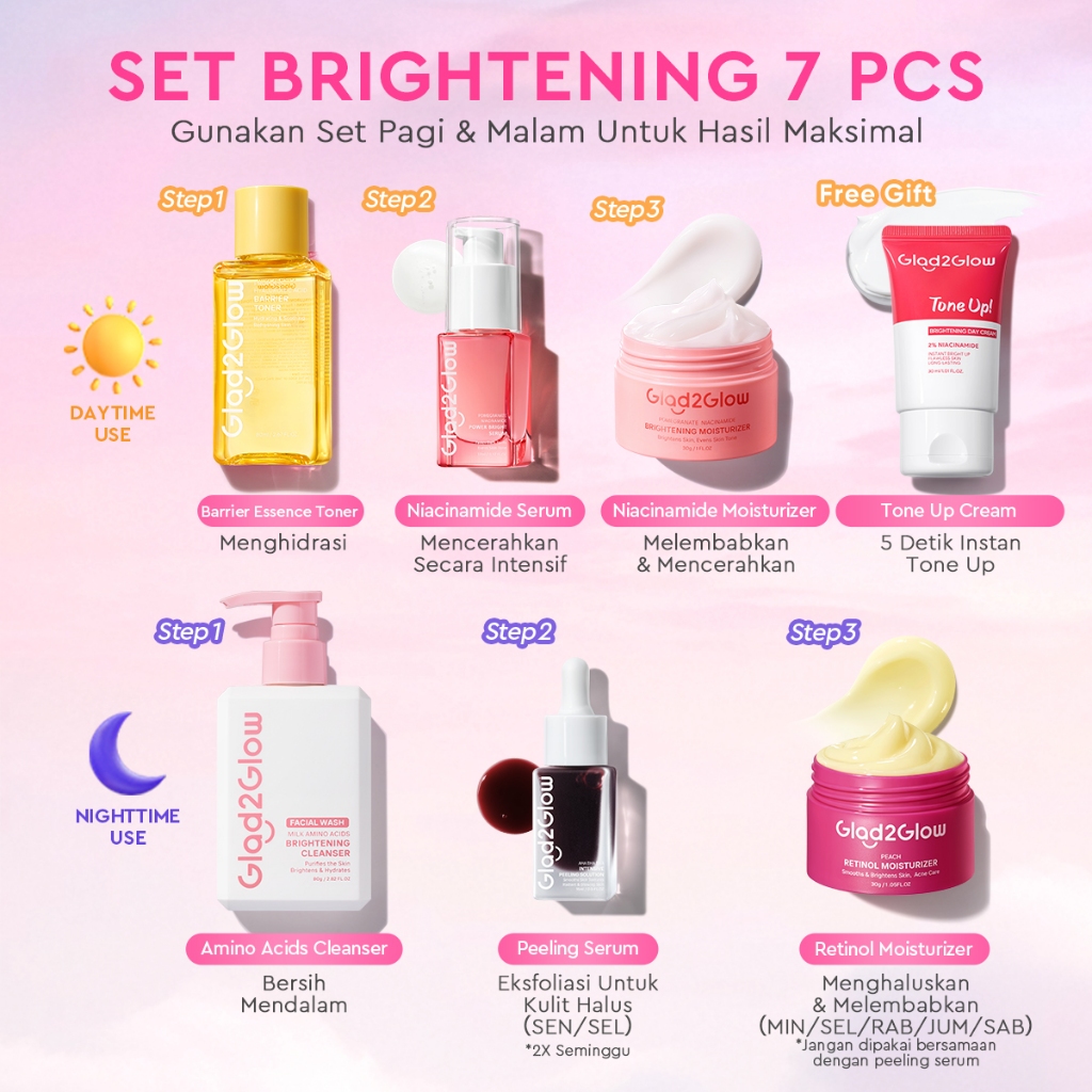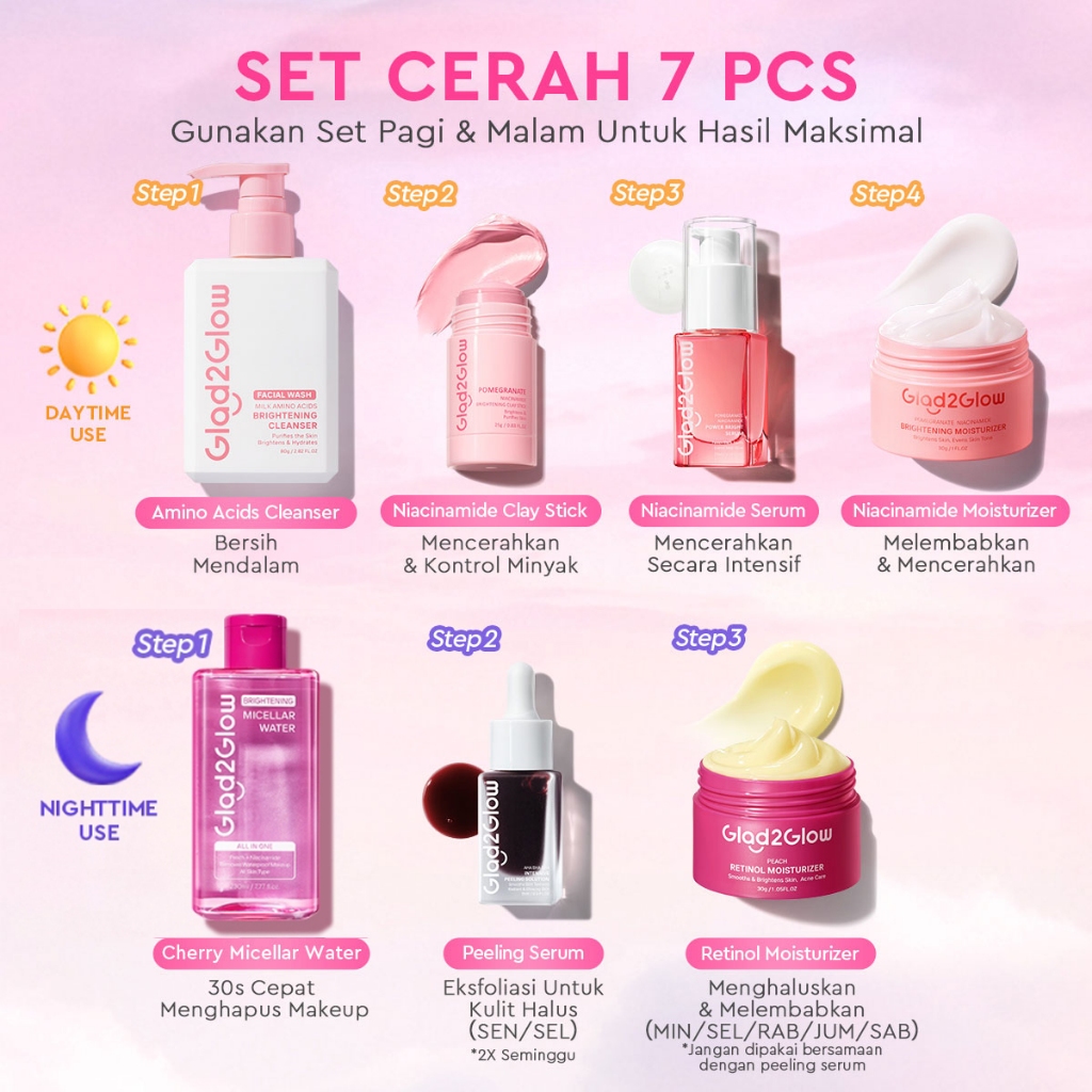 Glad2Glow Glowing & Renew bundle 7in1 7pcs-Brightening toner+Brightening Moisturizer+Milk Cleanser+Brightening Serum+Retinol moisturizer Pomegranate Niacinamide Mencerahkan Wajah Mencerahkan Melembabkan Kulit skin skincare G2G