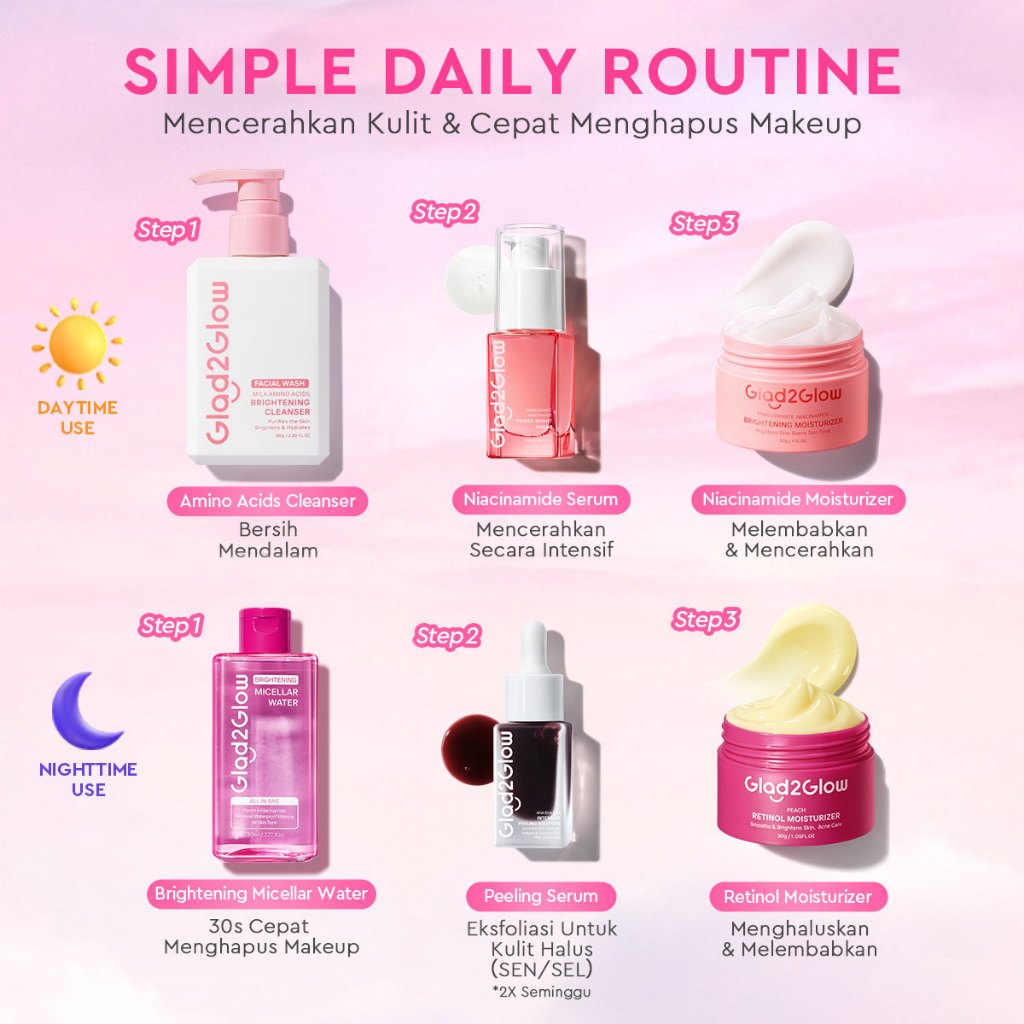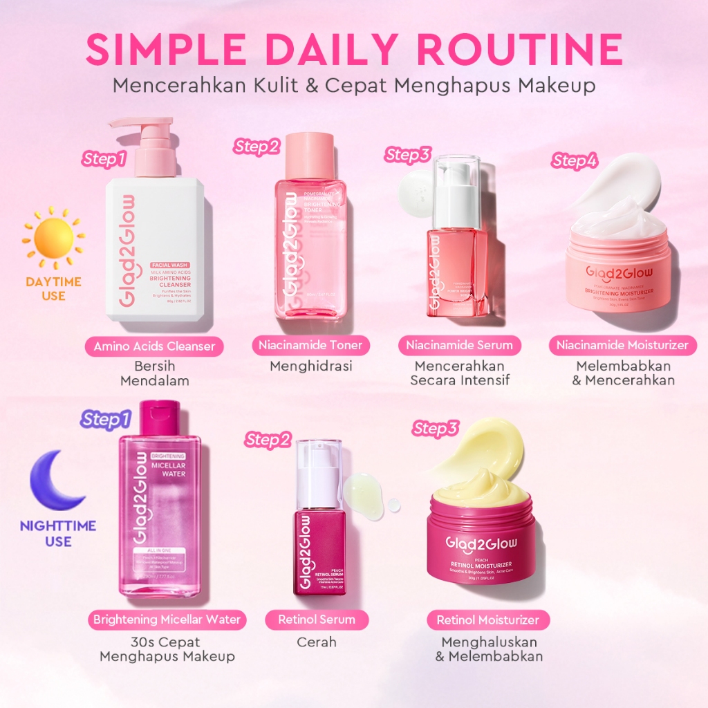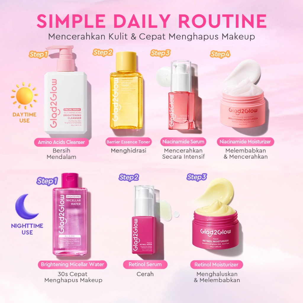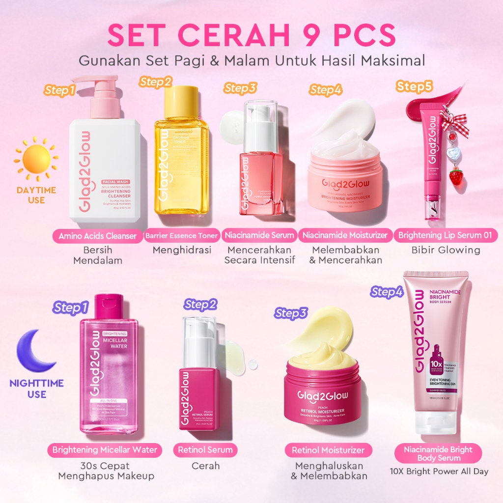 Glad2Glow Glowing & Renew bundle 7in1 7pcs-Brightening toner+Brightening Moisturizer+Milk Cleanser+Brightening Serum+Retinol moisturizer Pomegranate Niacinamide Mencerahkan Wajah Mencerahkan Melembabkan Kulit skin skincare G2G