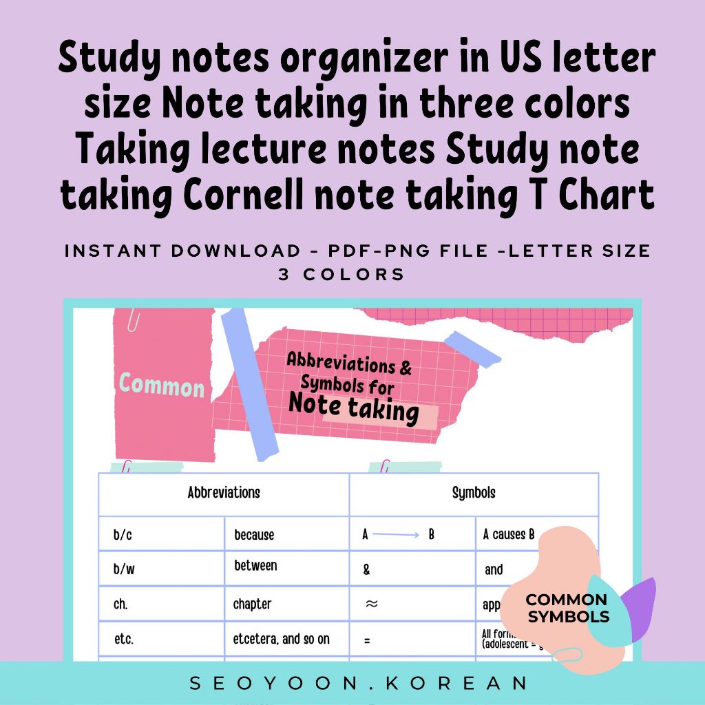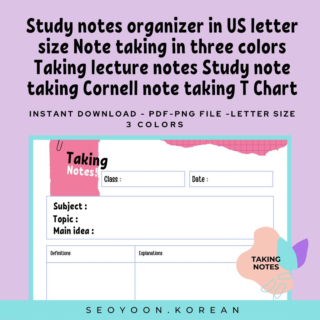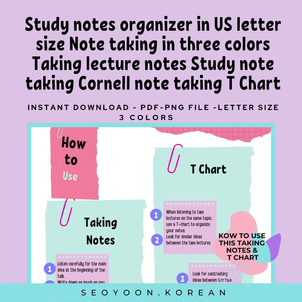 Study notes organizer in US letter size Note taking in three colors Taking lecture notes Study note taking Cornell note taking T Chart PDF File