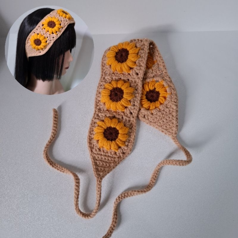 Sunflower crochet headband - bando rajut bunga matahari - bandana rajut - ikat kepala rajut bunga matahari