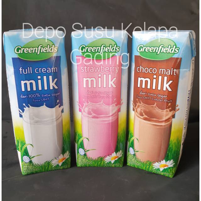 Susu Greenfields UHT 200 ml Full Cream Coklat Strawberry Milk | Greenfield 200ml Choco Malt Fresh Caffe Latte Low Fat Belgian Chocolate with Almond Limited Edition