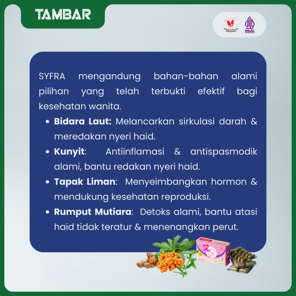 TAMBAR SYFRA – Obat Herbal Wanita untuk Melancarkan Haid & Meredakan Nyeri | Pil