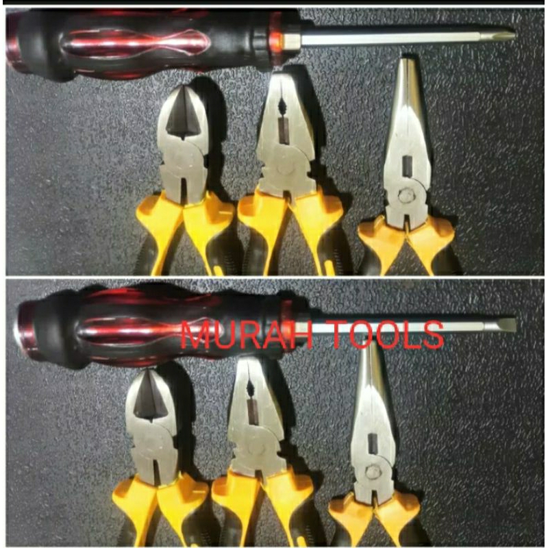 TANG SET PLES OBENG KETOK BOLAK BALIK TERDIRI DARING TANG LANCIP UKURAN 6INC TANG POTONG UKURAN 6INC TANG KOMBINASI UKURAN 6INC OBENG KETOK BOLAK BALIK MIN PLES