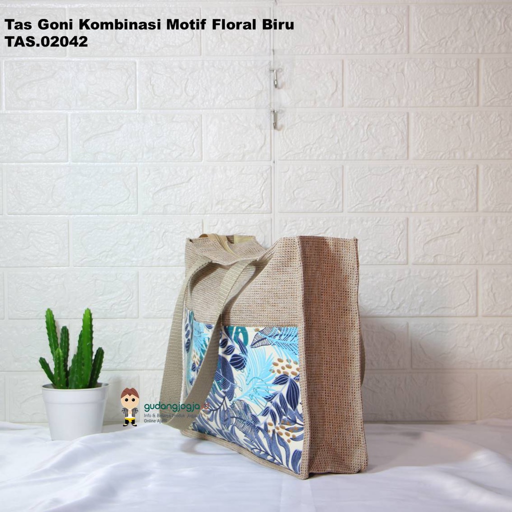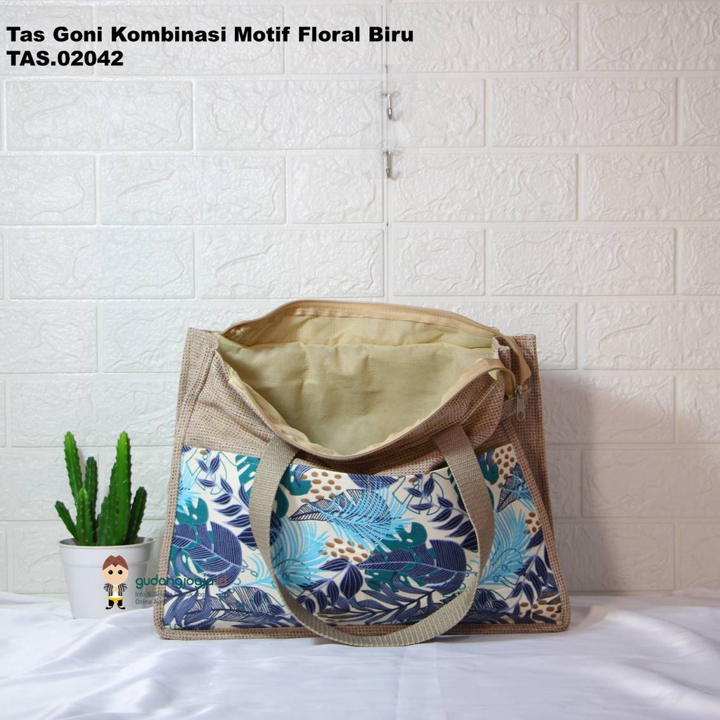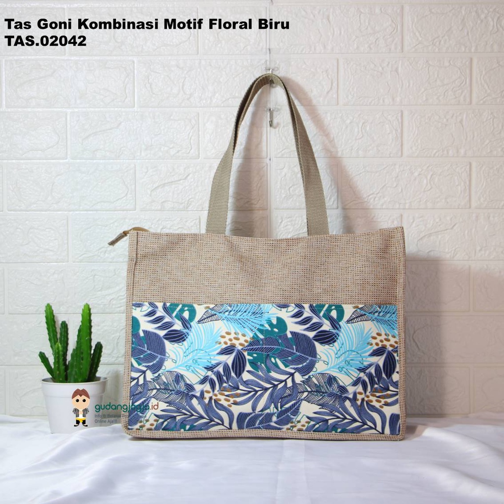 TAS KANVAS – TAS GONI – HANDBAG KANVAS – HANDBAG GONI MOTIF FLORAL BIRU. Gudangjogja.id