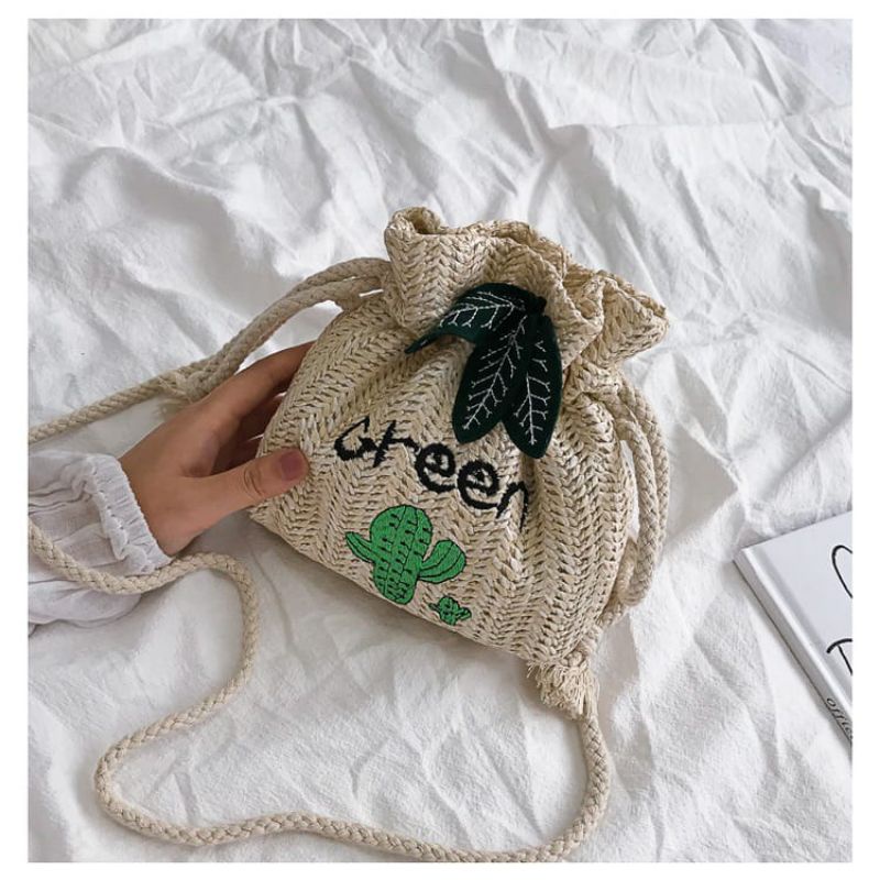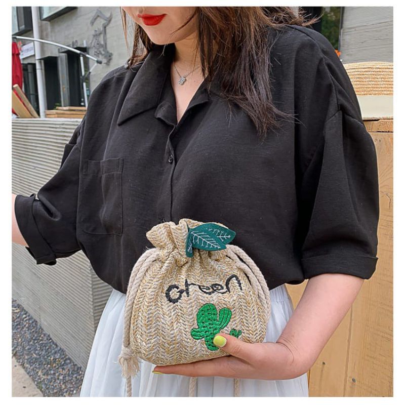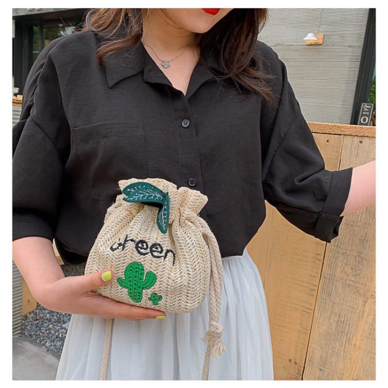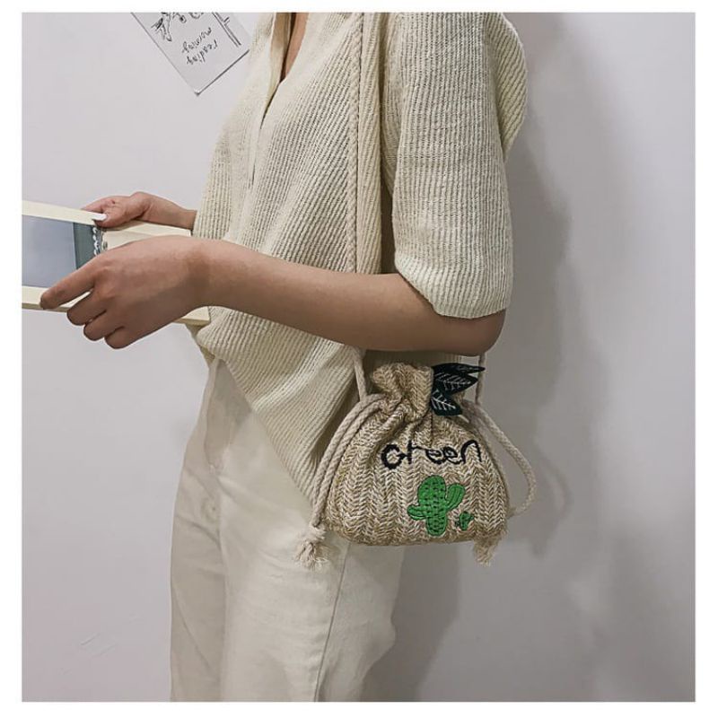 TAS SERUT MOTIF GREEN CACTUS/TAS SELEMPANG BUCKET SERUT BAHAN ANYAMAN MOTIF GAMBAR CACTUS