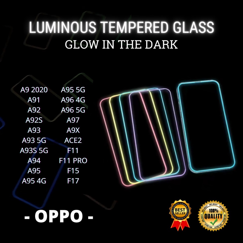 TEMPERED GLASS LUMINOUS GLOW IN DARK GOOD QUALITY <READY BANYAK TIPE HP> OPPO A9 2020-A91-A92-A92S-A93-A93 5G-A93S 5G-A94-A95-A95 4G-A95 5G-A96 4G-A96 5G-A97-A9X-ACE2-F11-F11 PRO-F15-F17