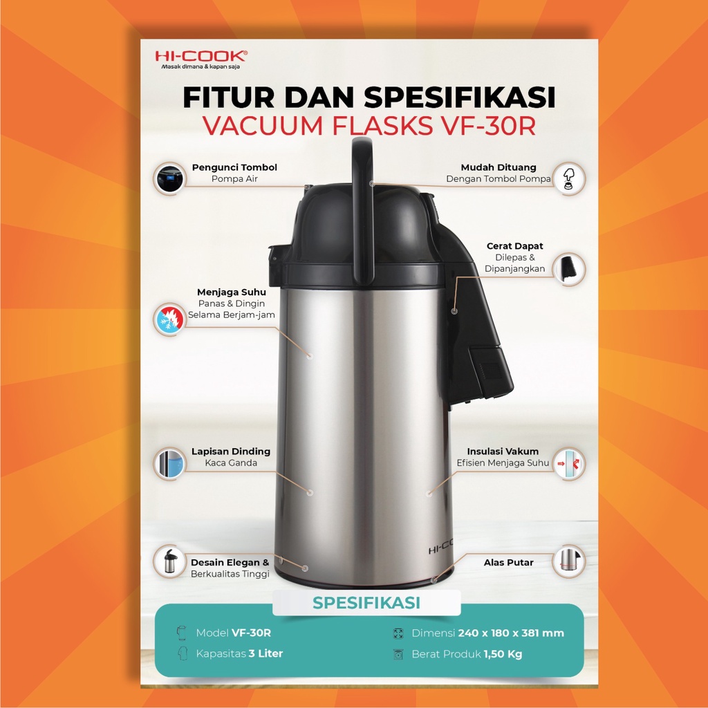 TERMOS AIR PANAS STAINLESS HI-COOK VACUUM/VACUM FLASK THERMOS VF-30R 3 LITER
