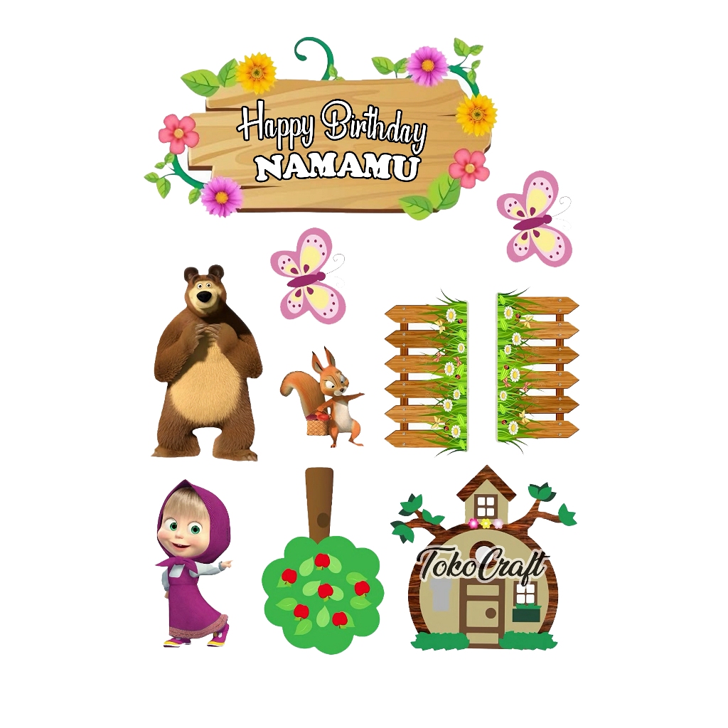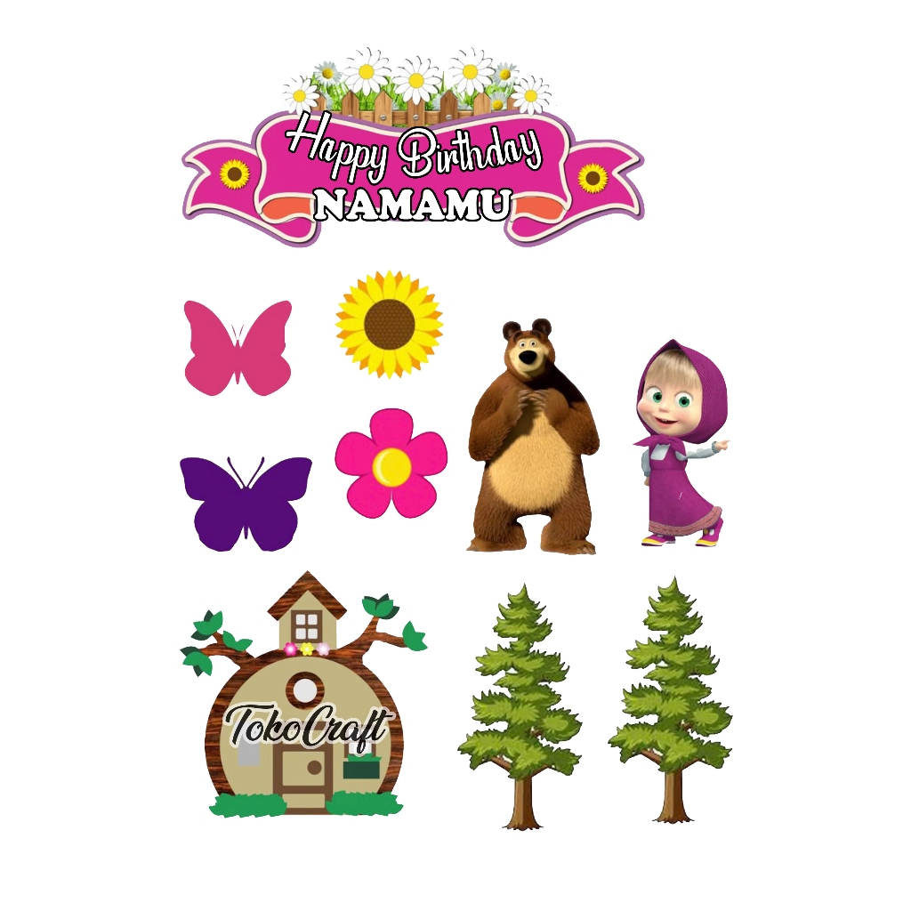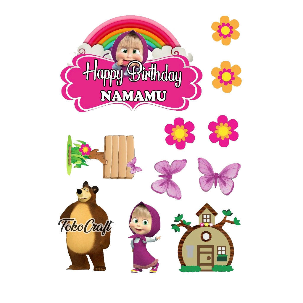 TOPPER CAKE MARSHA AND THE BEAR HIASAN KUE ULANG TAHUN CUSTOM NAMA HAPPY BIRTHDAY