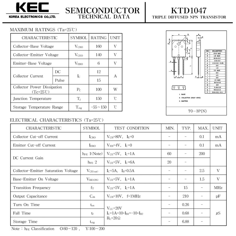 TRANSISTOR KTD1047 D1047 TR D 1047 KEC KTD 1047 TO-3P