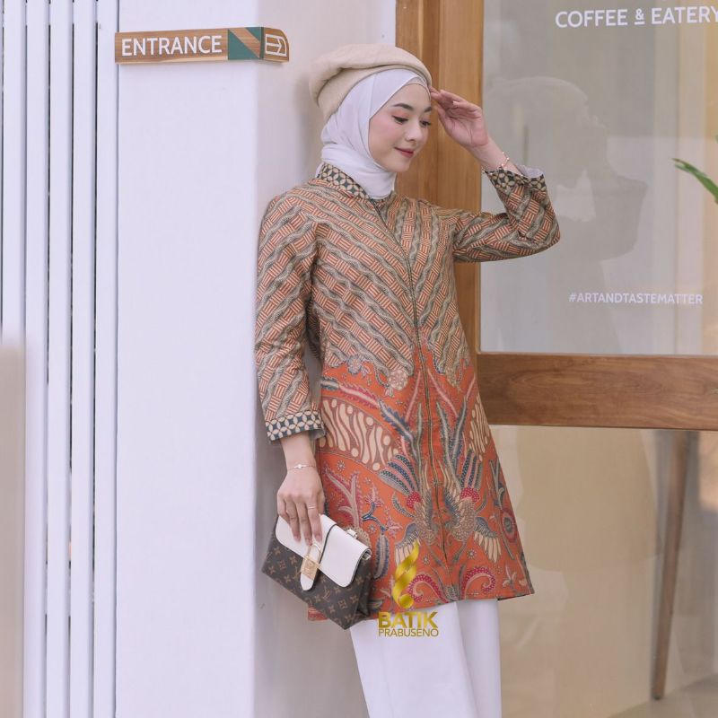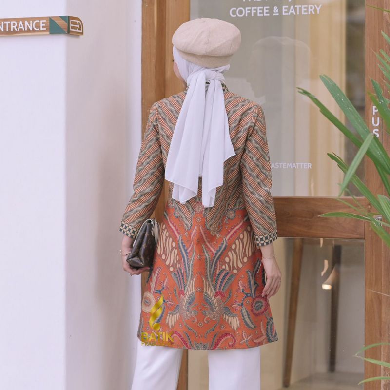 TUNIK OUTER MOTIF ANGGRAENI ATASAN BATIK WANITA TUNIK BATIK LENGAN PANJANG WARNA ORANGE ATASAN BATIK ZIPPER DEPAN BAJU BATIK LAPIS TRIKOT OUTER BATIK