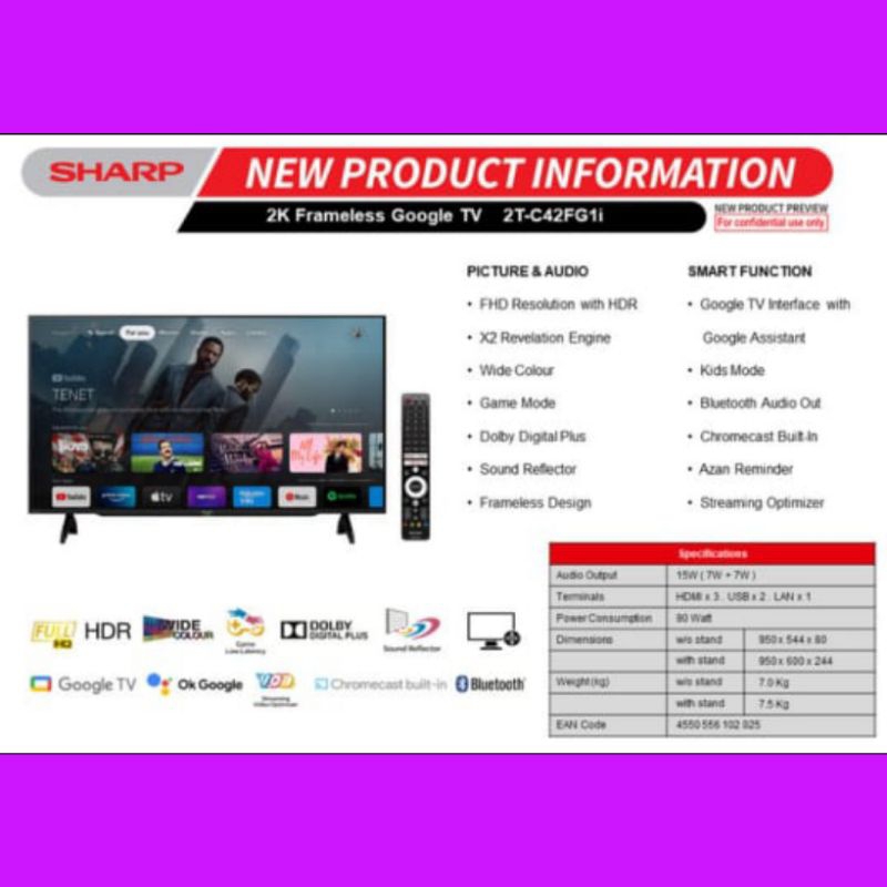 TV SHARP 42"INCH LED 42FG1I 2K-FHD-GOOGLE TV GARANSI RESMI(KHUSUS BATAM)