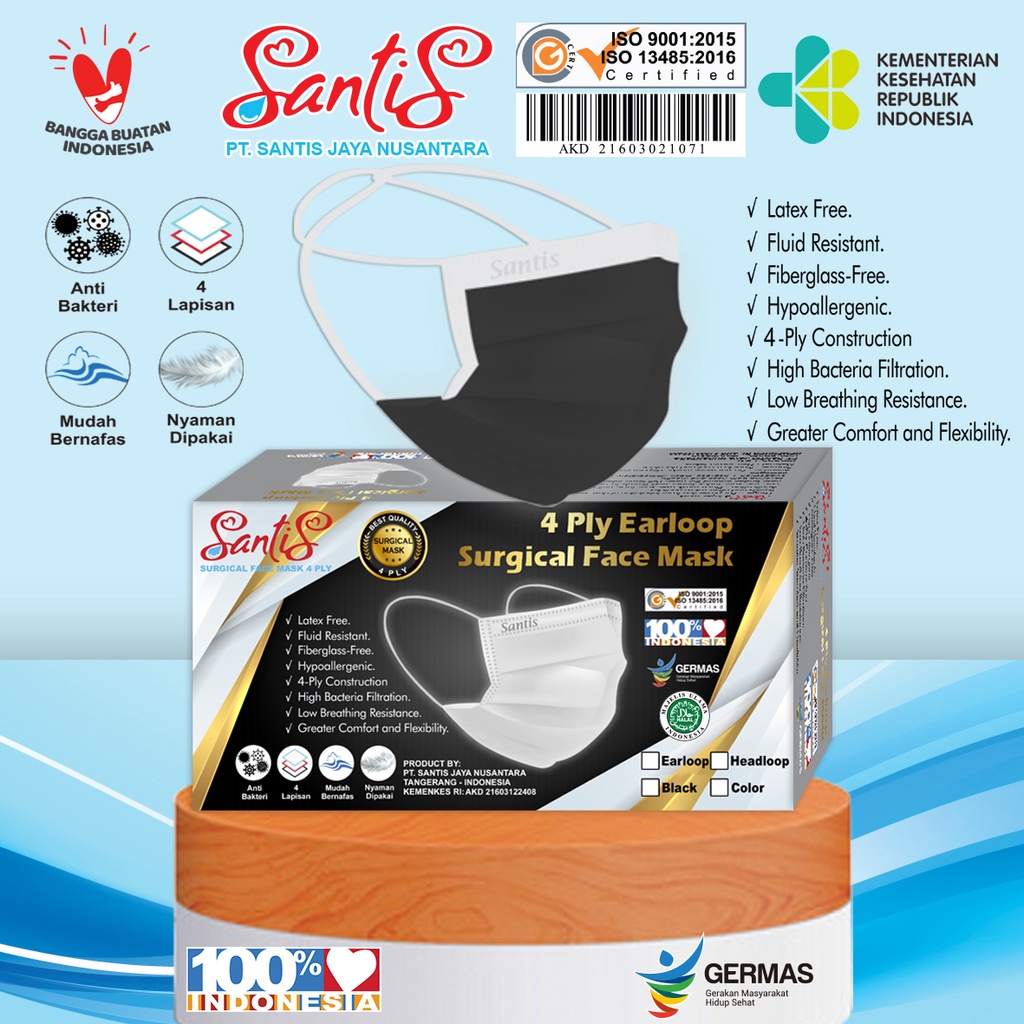 Masker Medis Headloop/Hijab 4ply / Surgical Face Mask by SANTIS