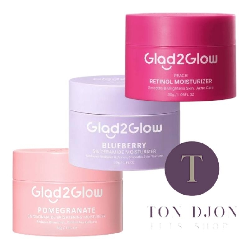 glad2glow pomegranate 5% niacinamide brightening moisturizer 30g / glad2glow retinol moisturizer peach 30g / glad2glow 5% ceramide moisturizer blueberry 30g