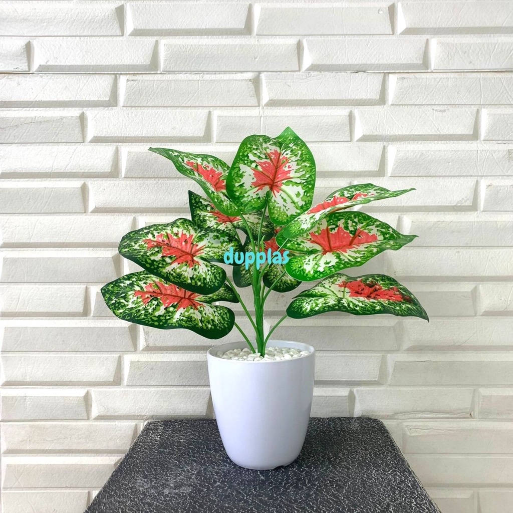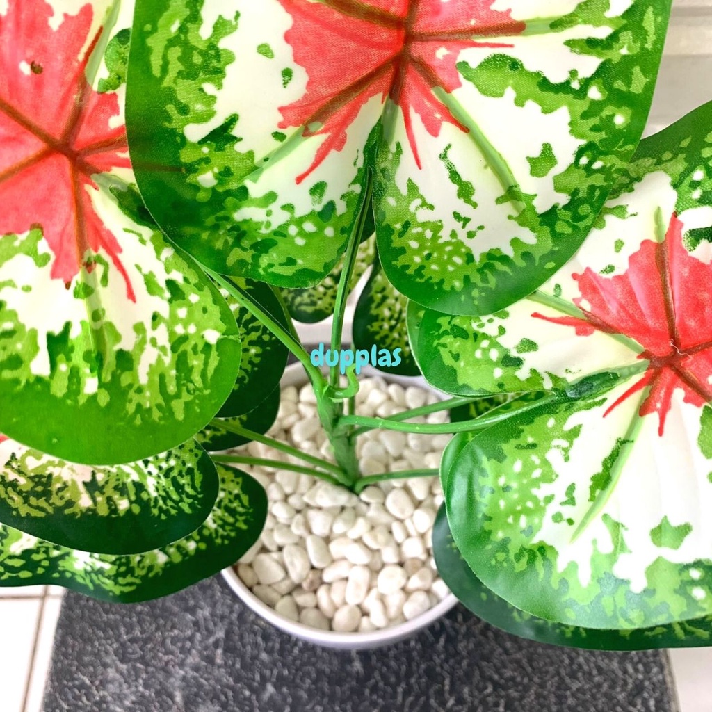 Tanaman Daun Bahagia X9 Merah Corak Semi Latex Artificial Pot Melamine Putih Pohon Plastik Hias Dekorasi Meja Ruangan Kantor Pajangan Rumah