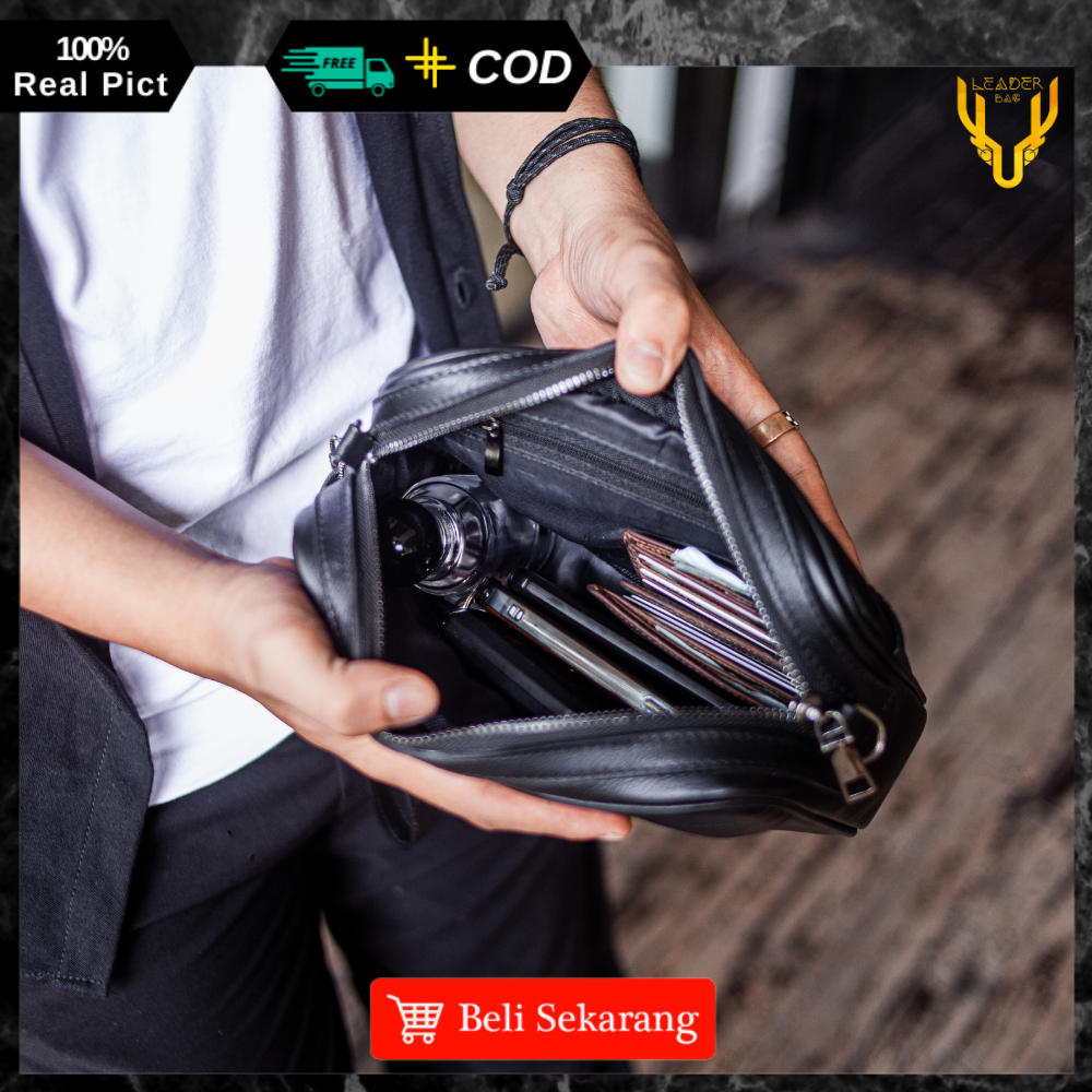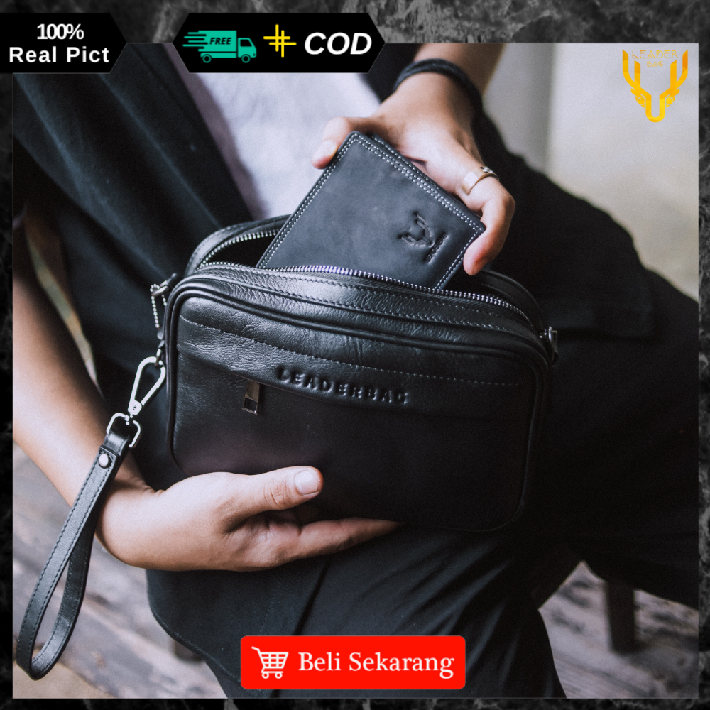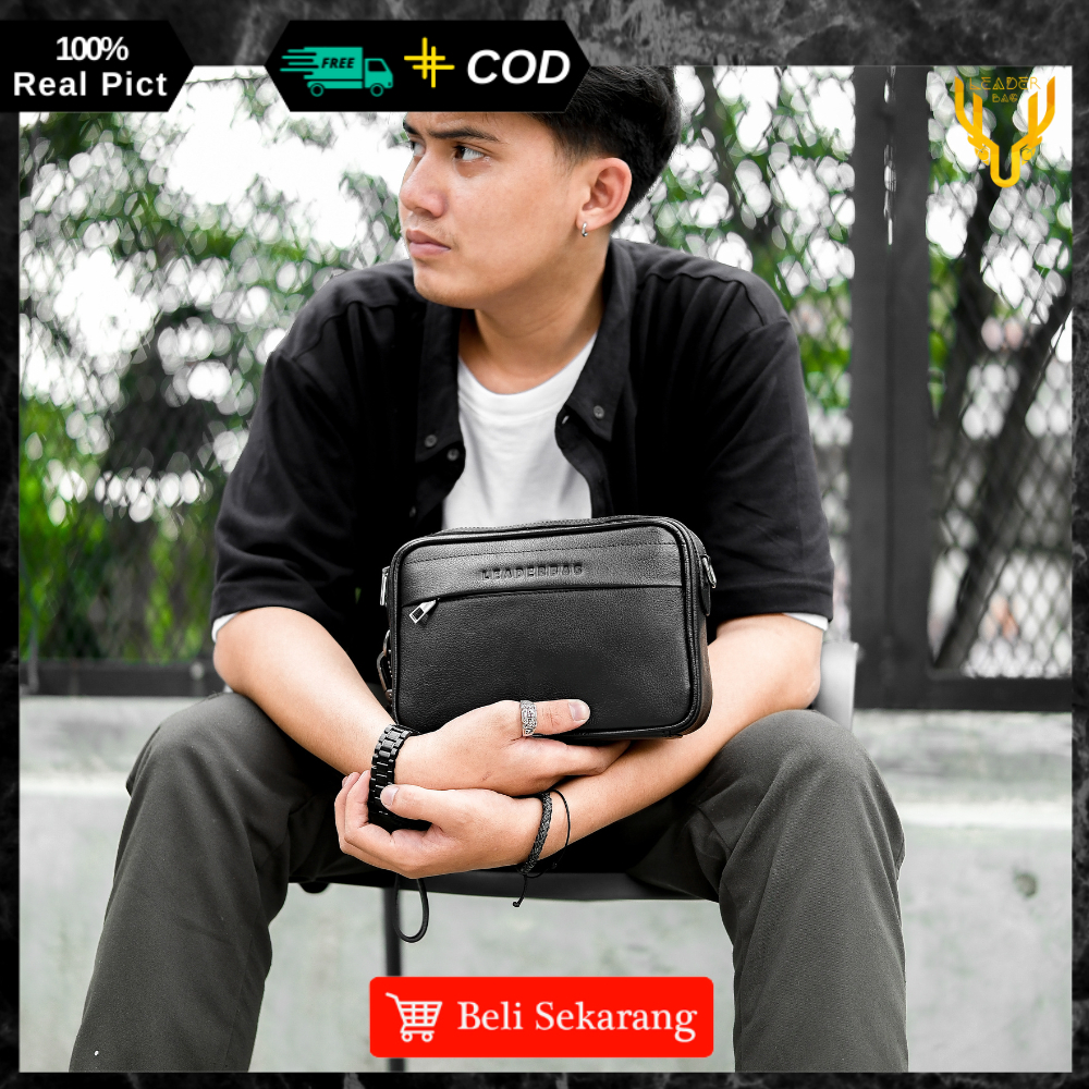 Tas Selempang Pria Kulit Sapi Asli Leaderbag Terbaru Warna Hitam Waterproof Atau Handbag Multifungsi Cowok Branded Tas Tangan Kulit MARCO