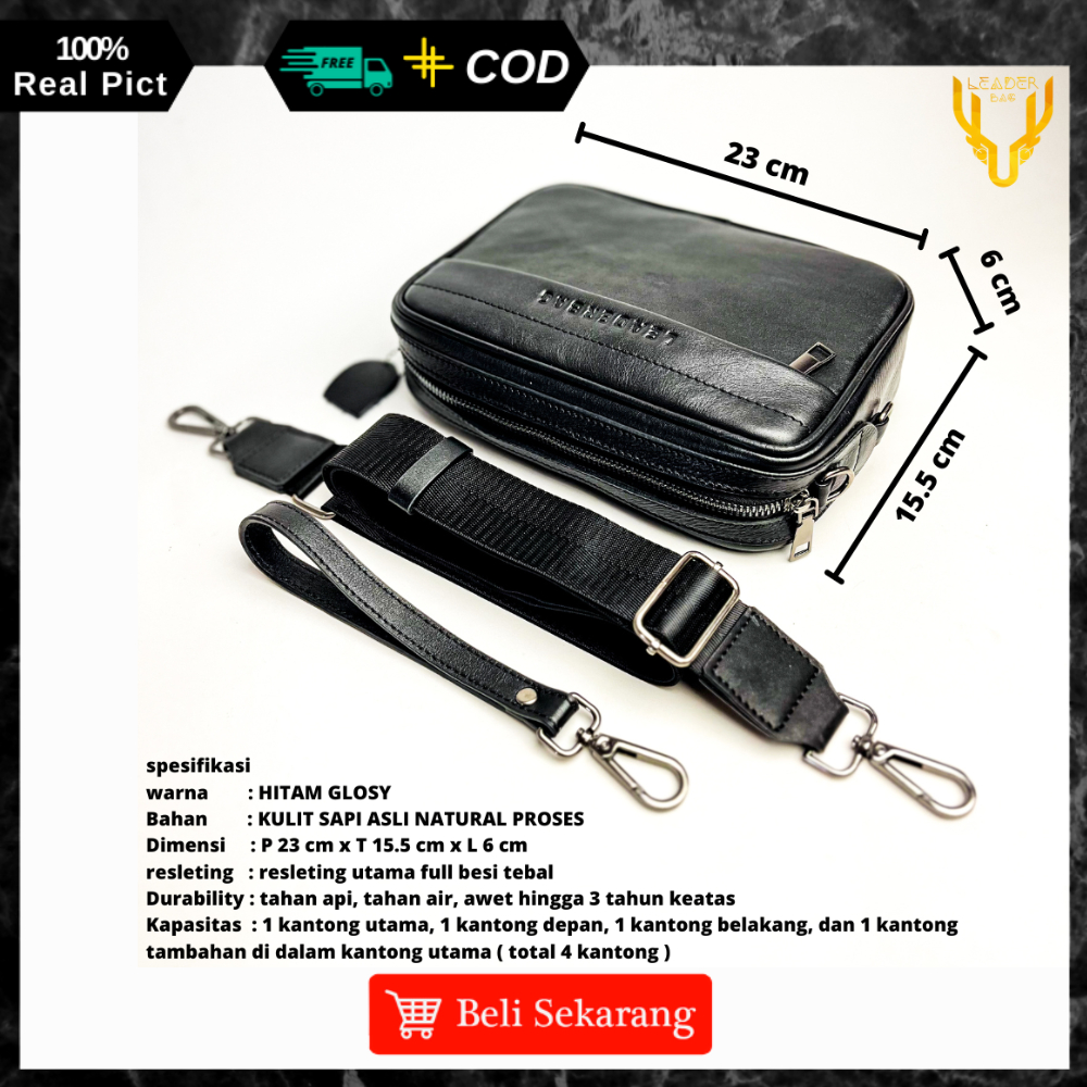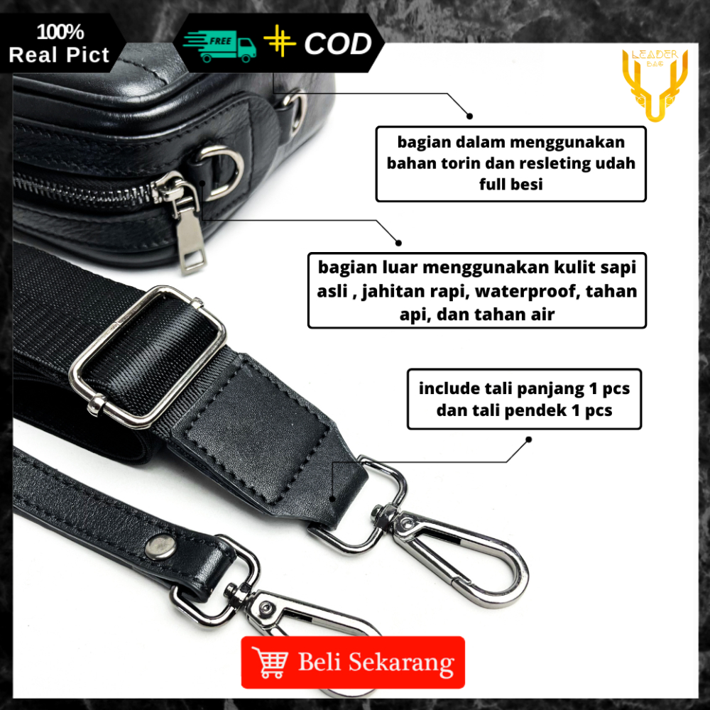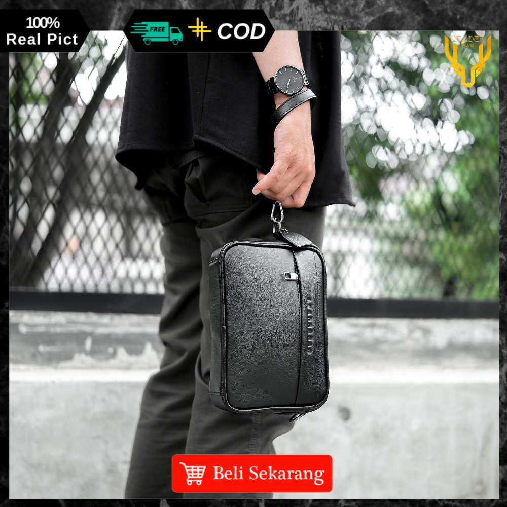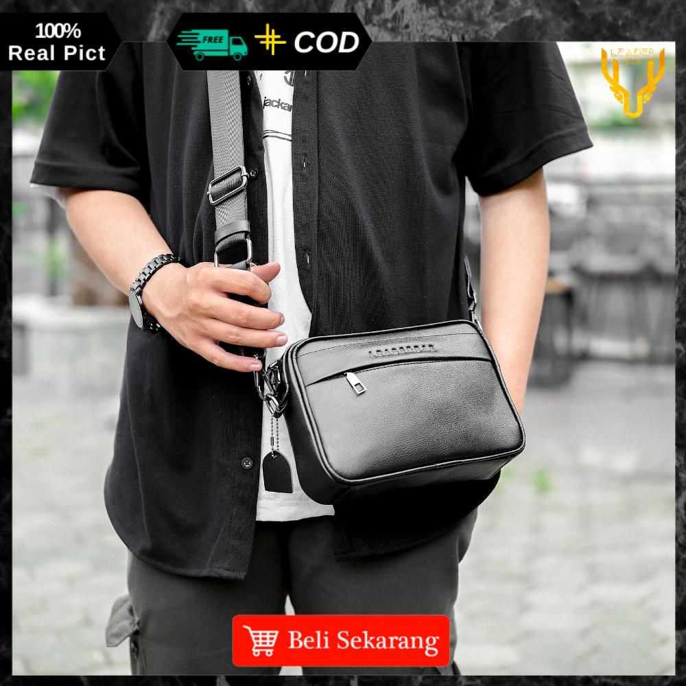 Tas Selempang Pria Kulit Sapi Asli Leaderbag Terbaru Warna Hitam Waterproof Atau Handbag Multifungsi Cowok Branded Tas Tangan Kulit MARCO