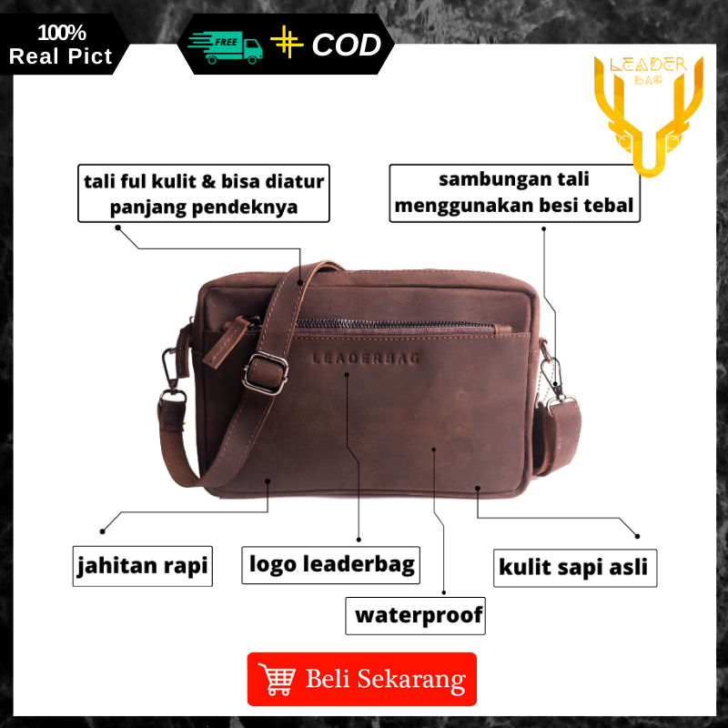 Tas Selempang Pria Kulit Sapi Asli Merk Leaderbag Terbaru Warna Coklat Atau Clutch Tas Tangan Cowok Keren Branded Waterproof LIBRA BB03