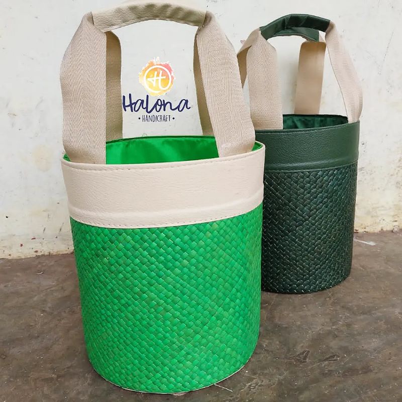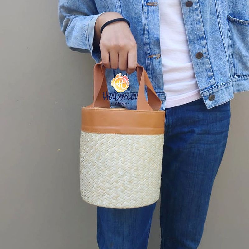 Tas ember anyaman pandan tali vinyl kulit imitasi