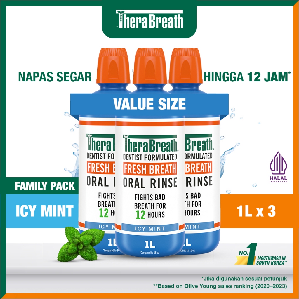 TheraBreath Mouthwash Icy Mint 1L x3 – Obat Kumur Premium, Formula Dokter Gigi, Nafas Segar & Bebas Alkohol