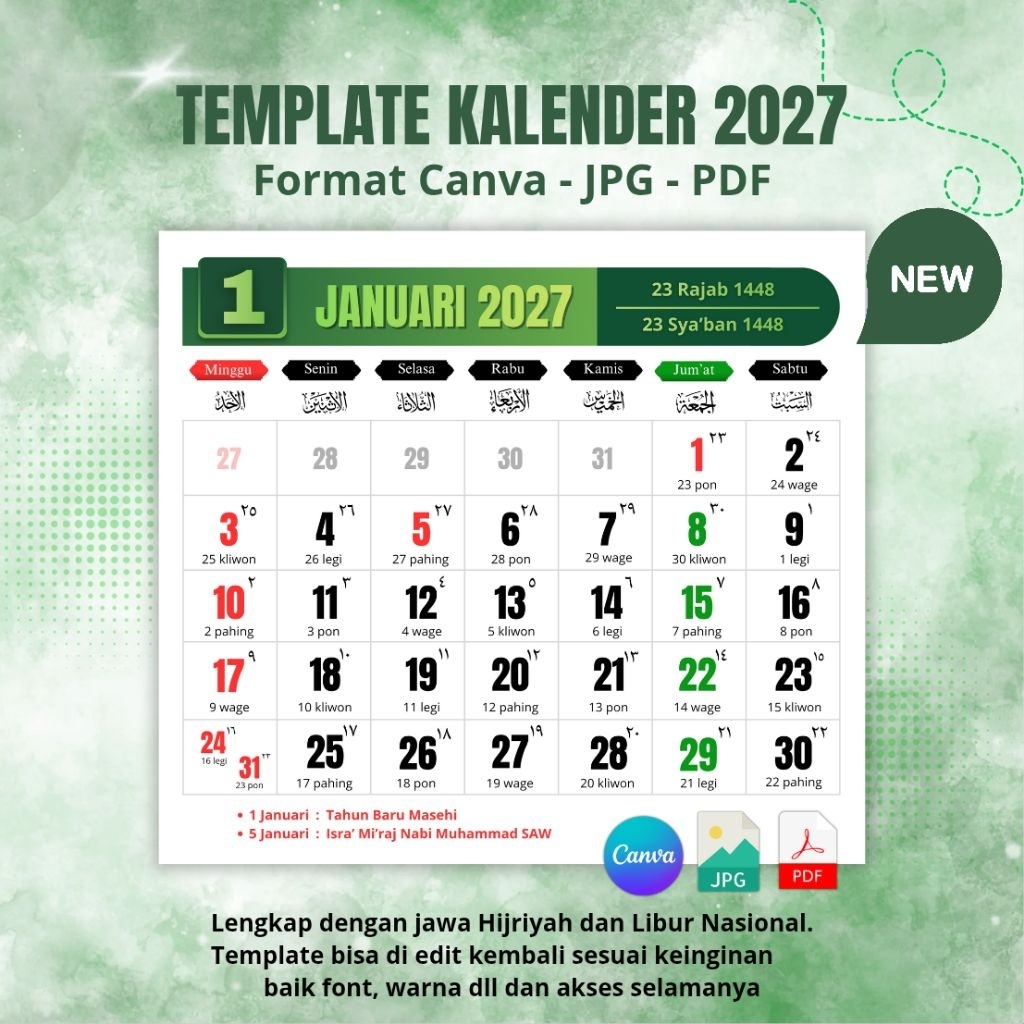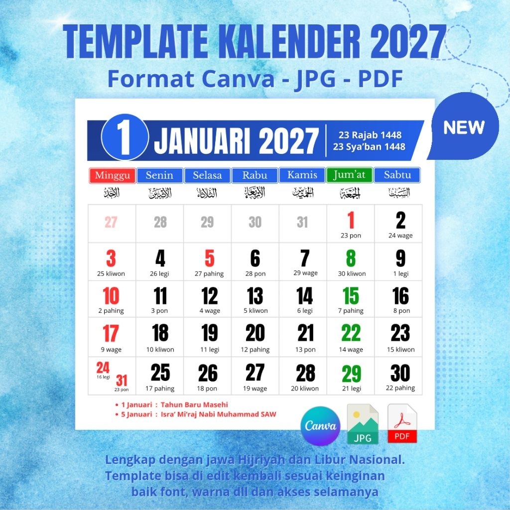Template kalender 2027 Format Canva / JPG / PDF - Lengkap Jawa Hijriyah dan Libur Nasional