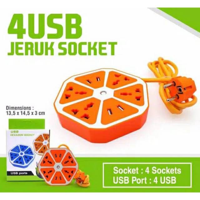 Terminal Listrik 4 Cabang + 4 Port USB & 2USB Stop Kontak Listrik 4 Lubang 4 Output Charger Motif Jeruk