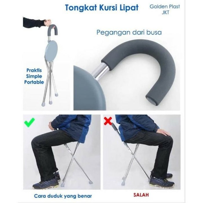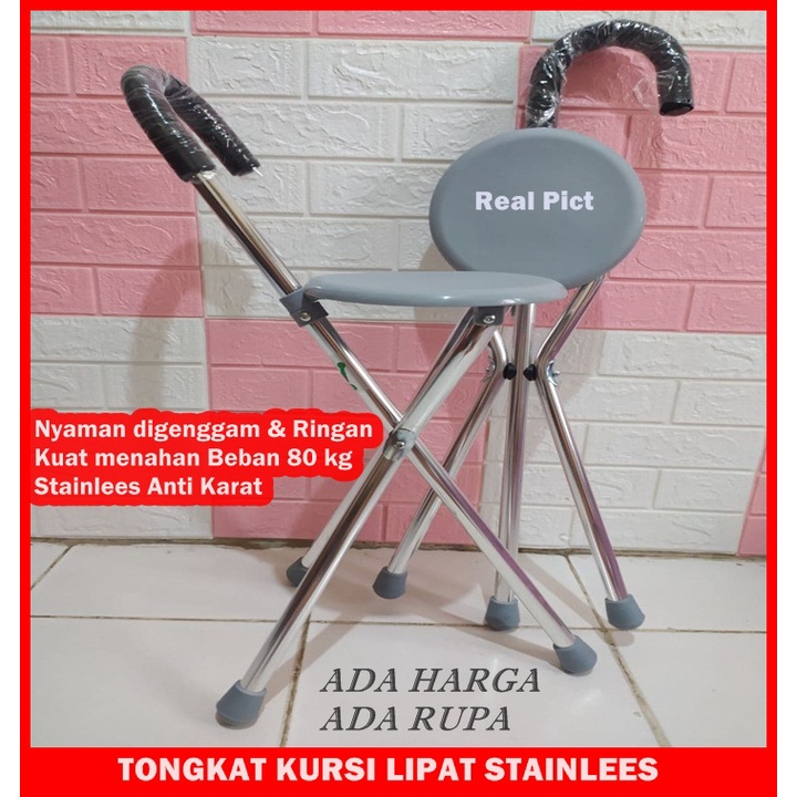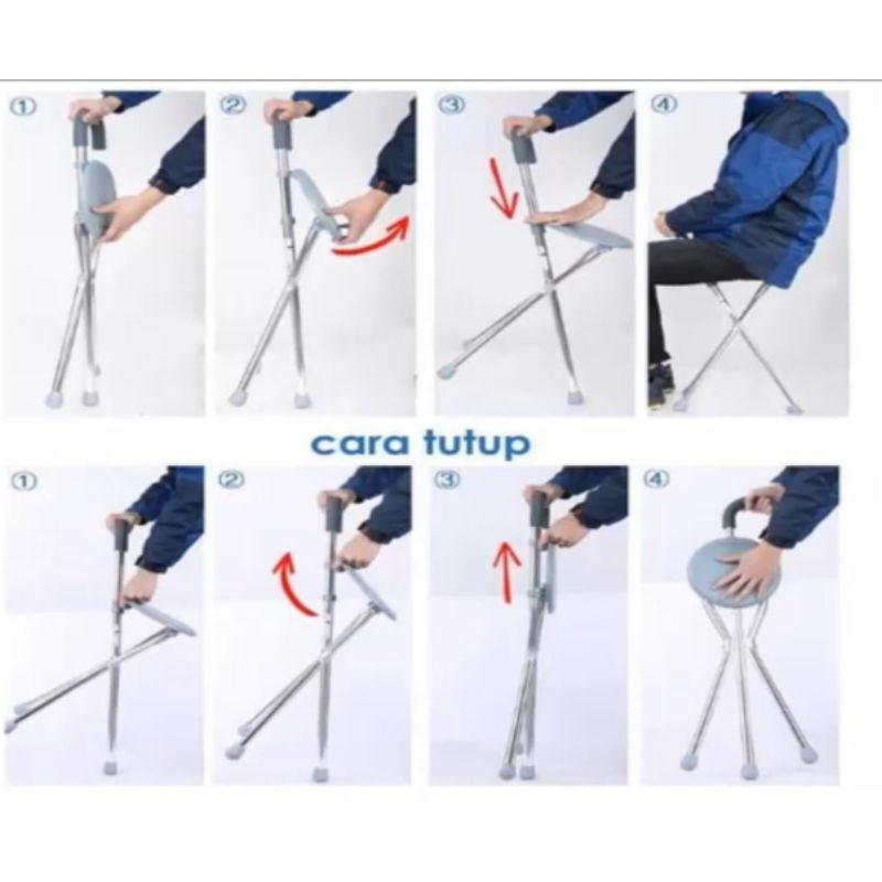 Tongkat Duduk Lipat Stainles Orang Tua / Tongkat Kursi Lipat / Kursi Bangku Sholat /Tongkat Jalan Orang Tua Lansia Stainless / Tongkat Lipat Lampu LED/Alat Bantu Jalan Orang Tua SELLACO / Tongkat duduk Sholat Umroh Haji