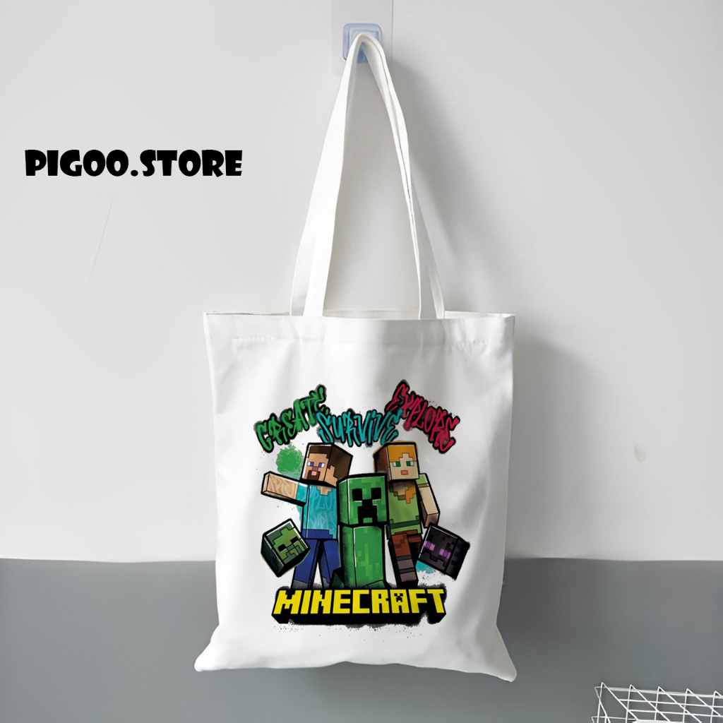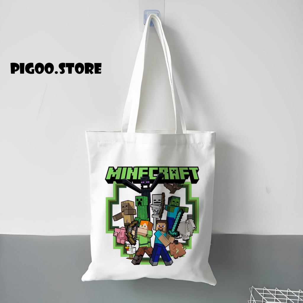 Tote Bag Kanvas Putih Minecraft Resleting / Totebag Wanita Pria / Tote Bag sekolah Kuliah / Tas Korea / Tote Bag Estetik / Tote bag Murah / Tas Custom / Tas Unisex / Goodiebag Hampers Ulang Tahun Custom