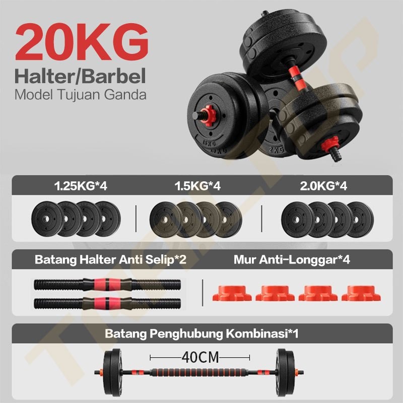 TrailTop Barbel 20kg Set Beban Bisa Diatur 5-20kg Bahan PVC Anti Slip Dumbel Alat Olahraga Di Rumah