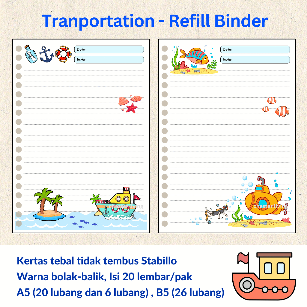 Transportasi - Loose leaf A5 B5 | Isi Kertas File Refill Map Binder | Notes Notebook Memo Buku Tulis