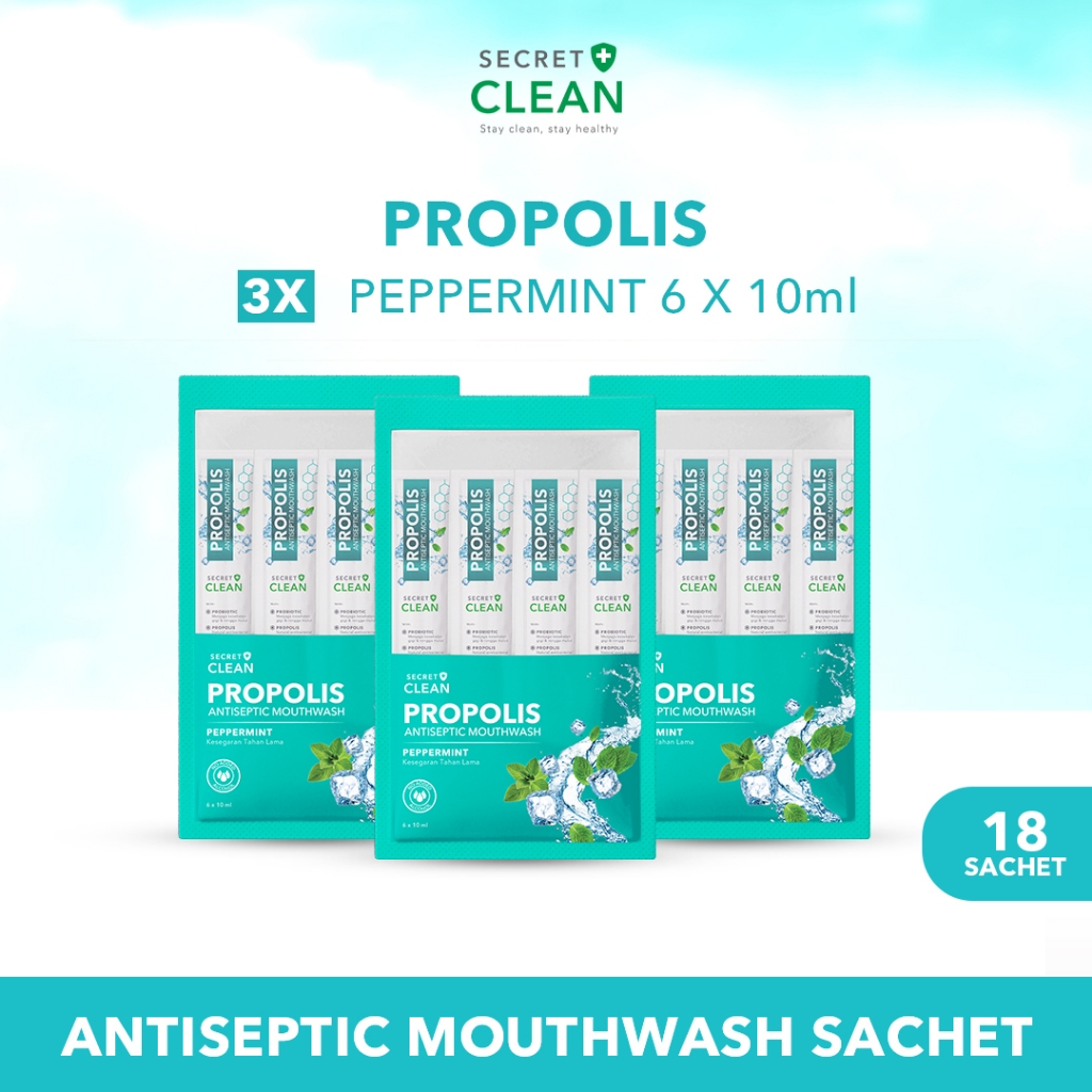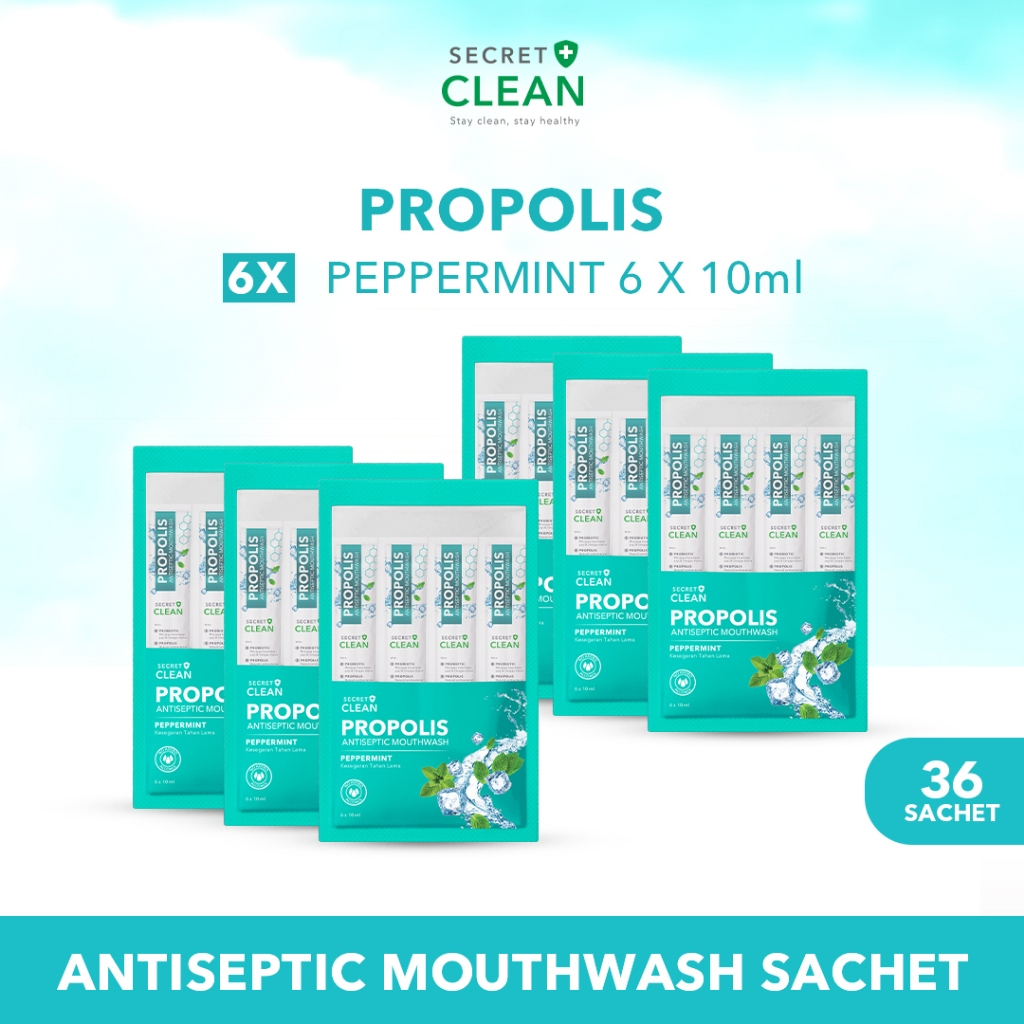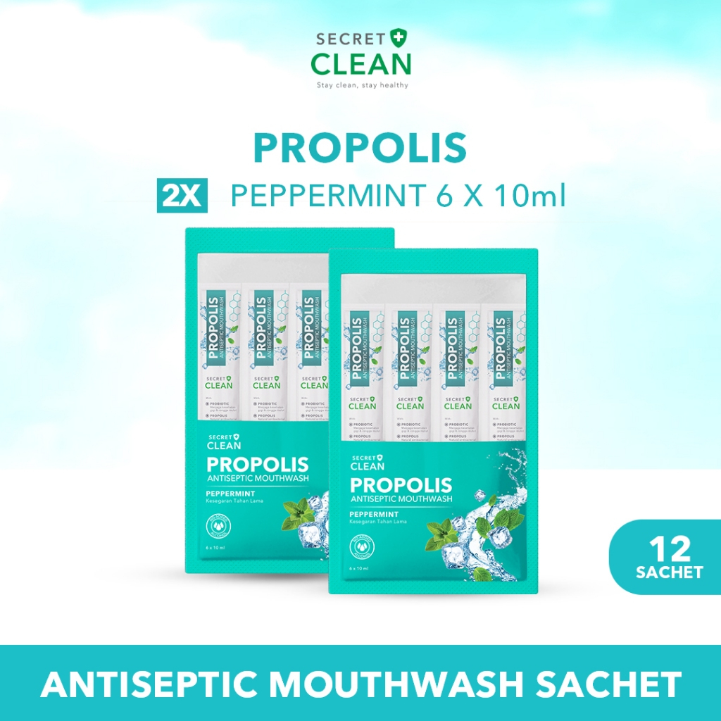 Secret Clean Propolis Mouthwash Sachet Peppermint 10ml x 6 sachet - isi 1 bag, 2 bag, 3 bag, 6 bag | Obat Kumur Antiseptik Halal Tanpa Alkohol
