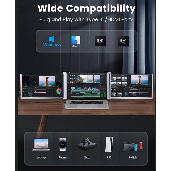 Triple Portable Monitor for Laptop, FHD 1080P WINDOWS Macbook M Series M1 M2 Pro M3 MAC OS IPS Laptop Screen Extender for Dual Monitor Display, USB-C & HDMI Plug and Play Triple Monitor for 13.3 inch-17.3" Laptops