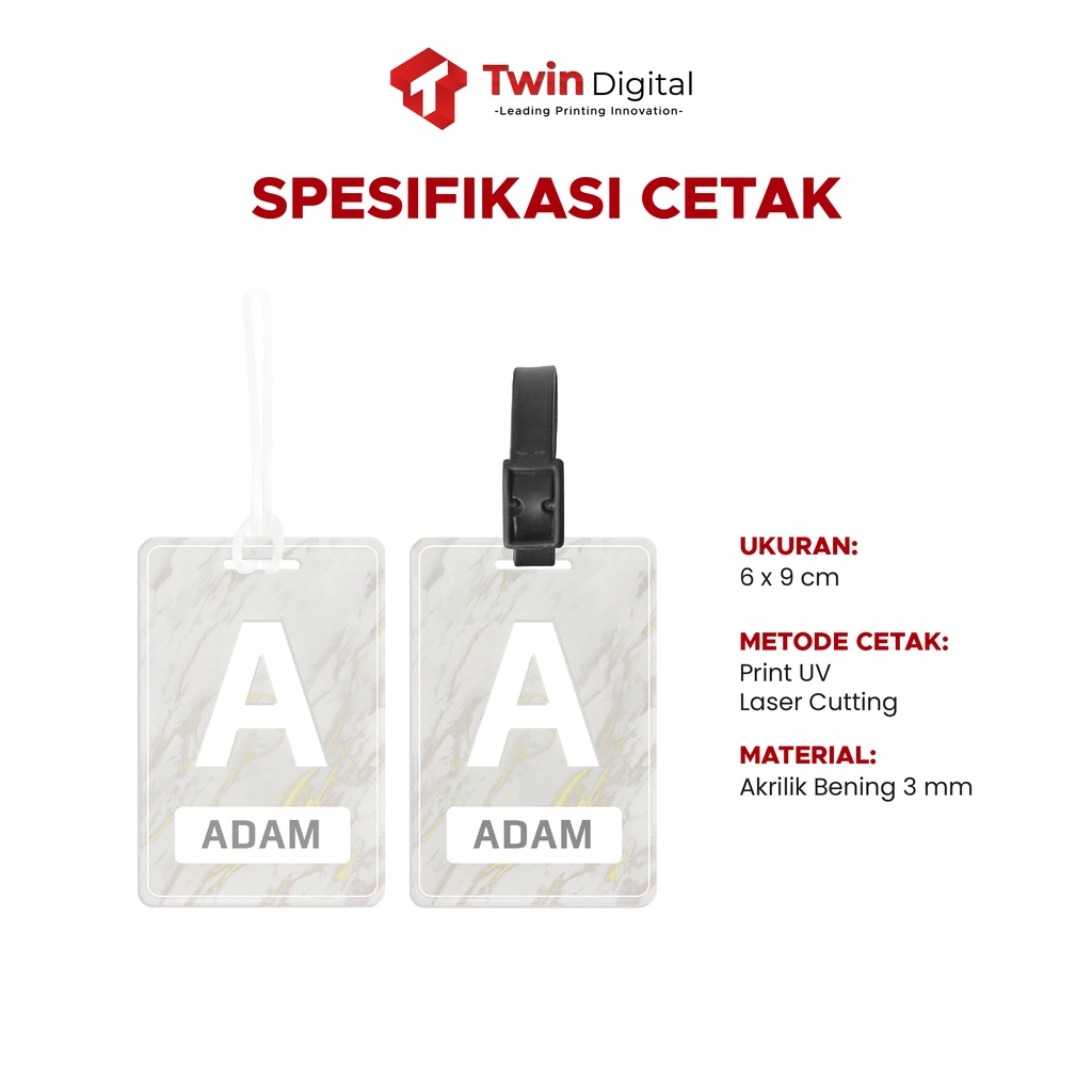 Twindigital Custom Luggage Tag Akrilik Gantungan Label Nama Tas Koper Print UV - Bag Tag Kotak Marble Putih Inisial