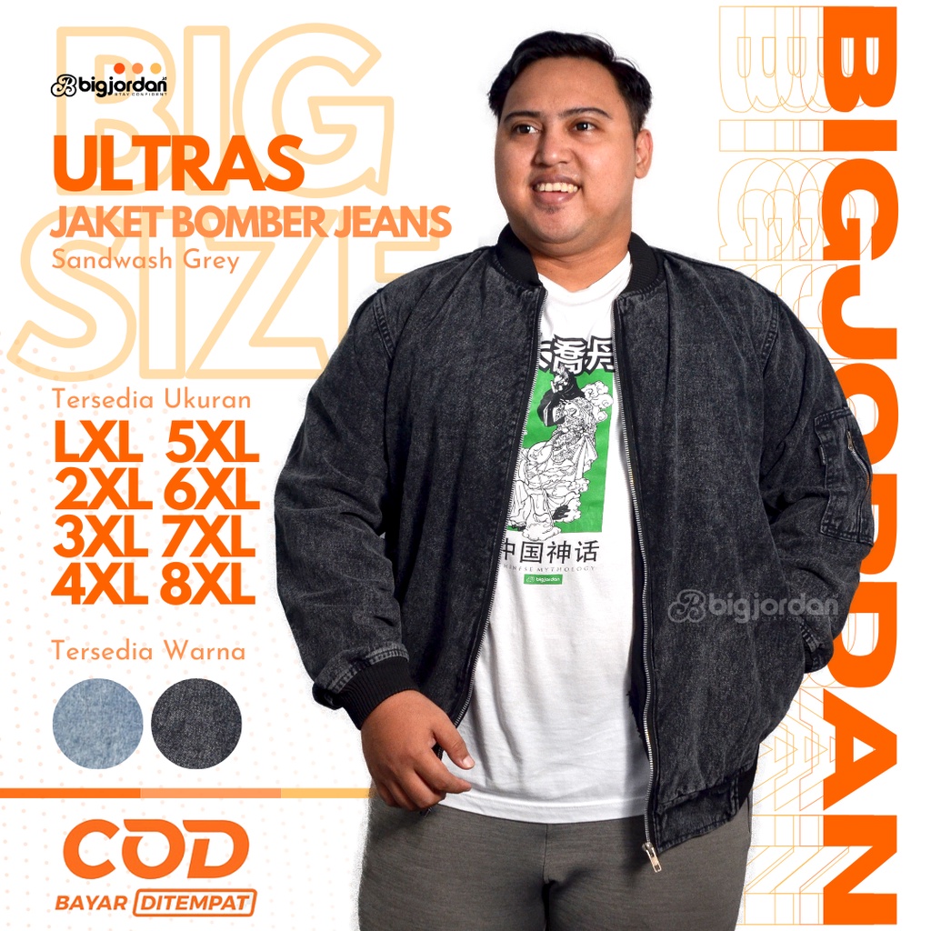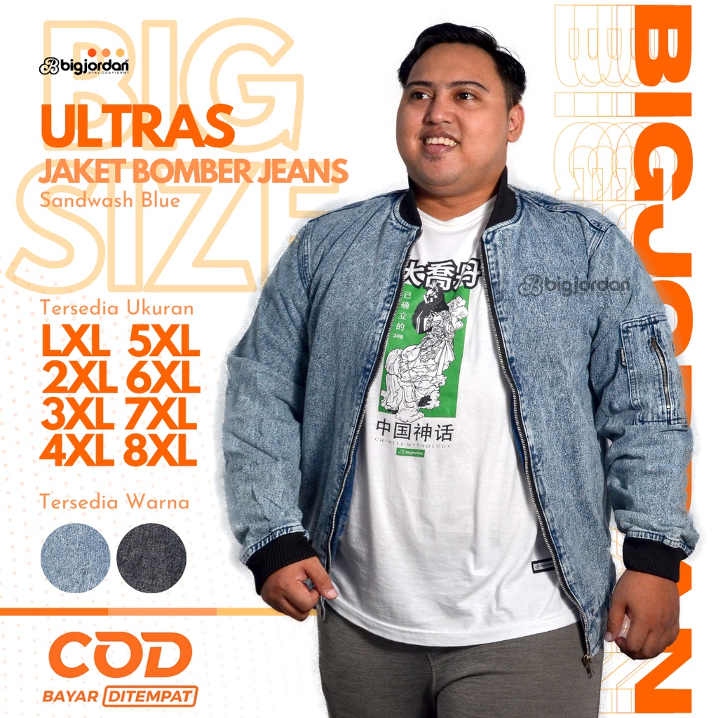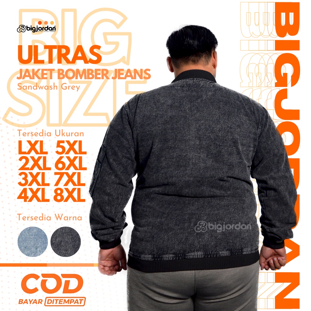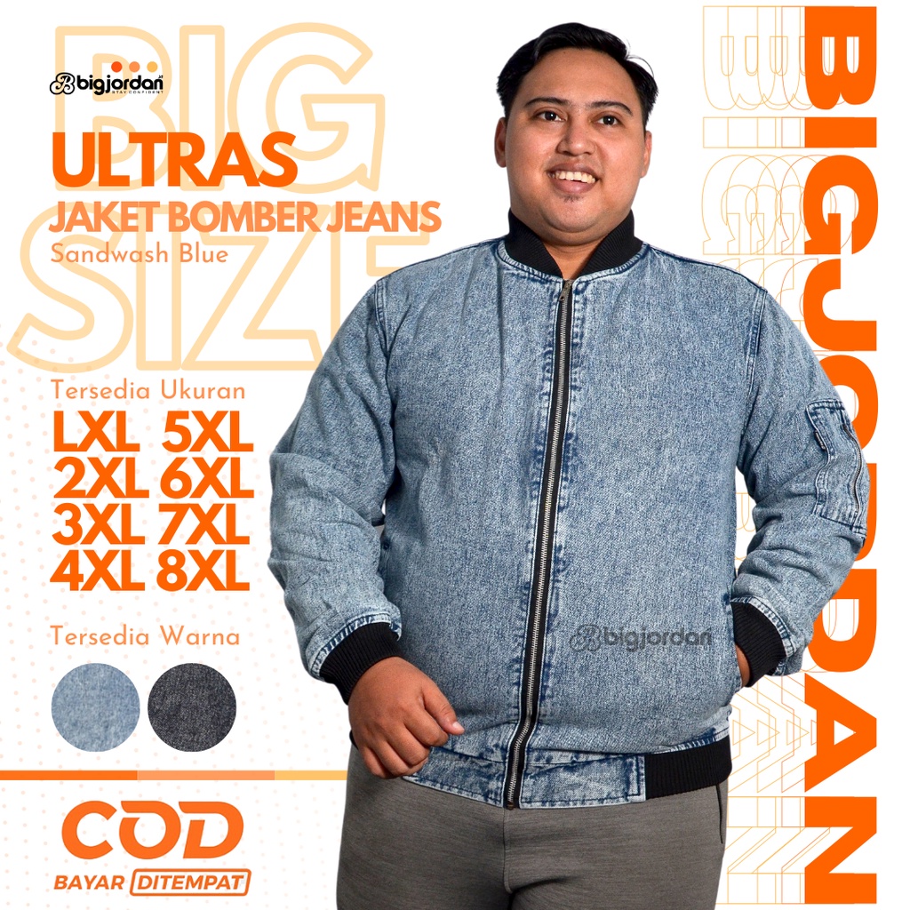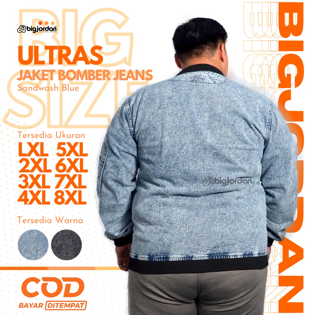 ULTRAS Jaket Bomber Jeans Pria Jumbo Size XXL XXXL XXXXL XXXXXL jaket jeans big size 3XL 4XL 5XL 6XL 7XL 8XL jaket denim sandwash blue oversize wanita plussize original big jordan
