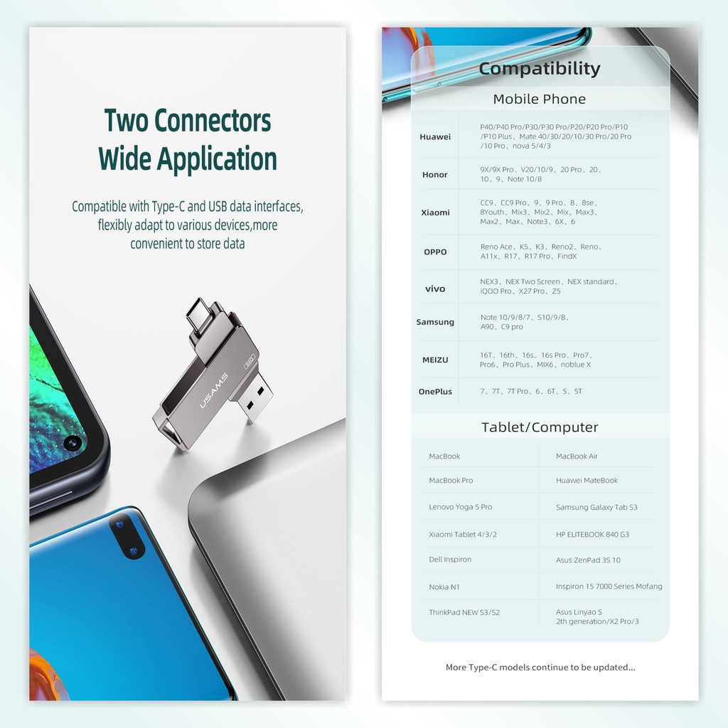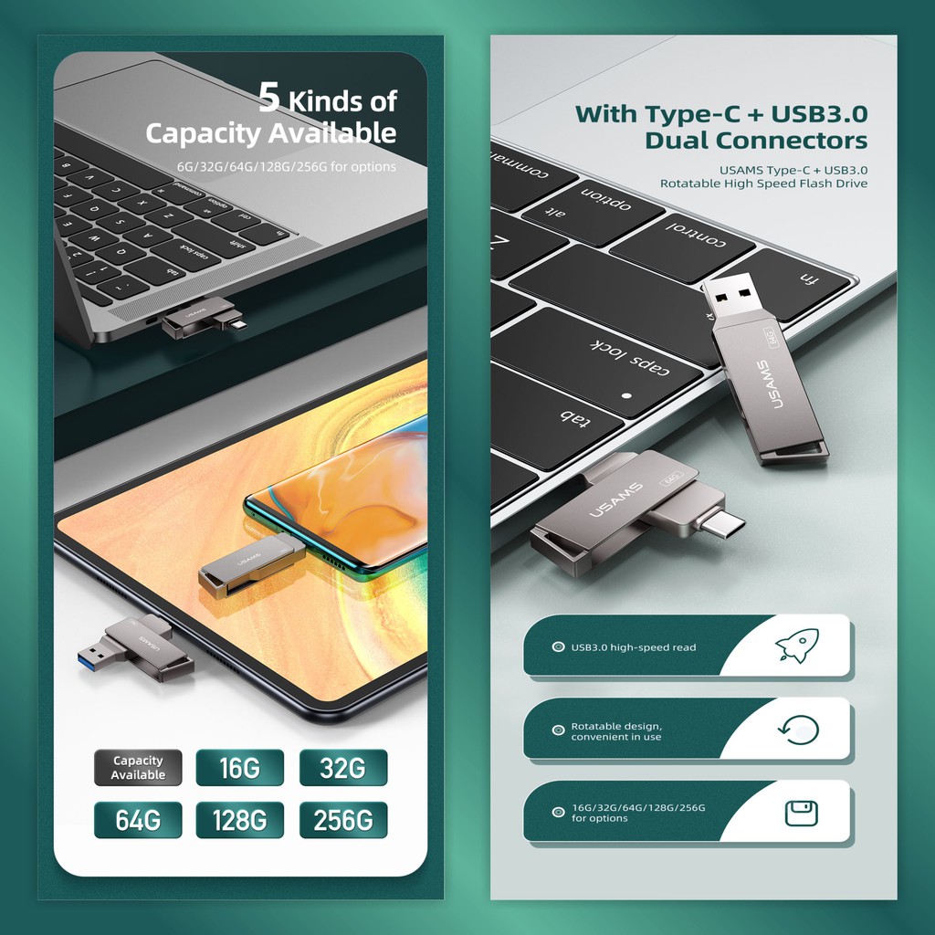 USAMS Flashdisk OTG Dual Drive USB3.0 + Type C Rotatable High Speed 16GB 32GB 64GB 128GB 256GB
