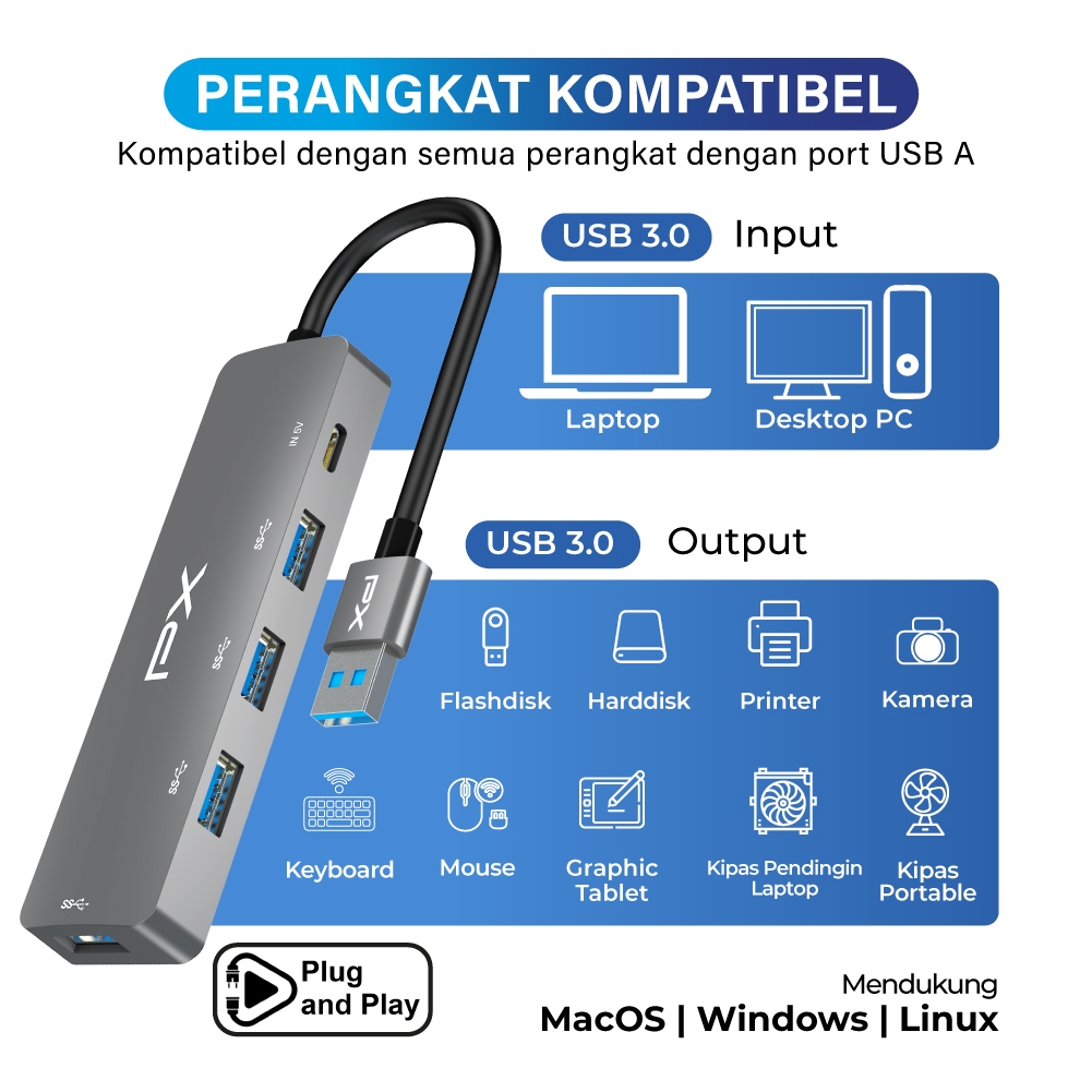 USB Hub Converter USB 3.0 Connector Adaptor Laptop 5 in 1 PX UCH05S