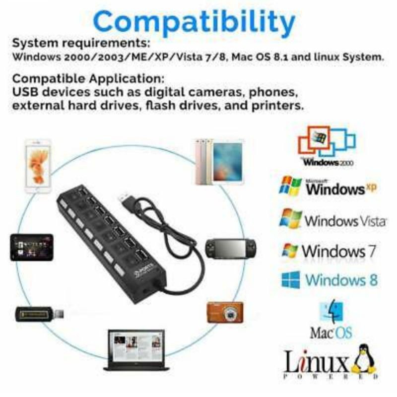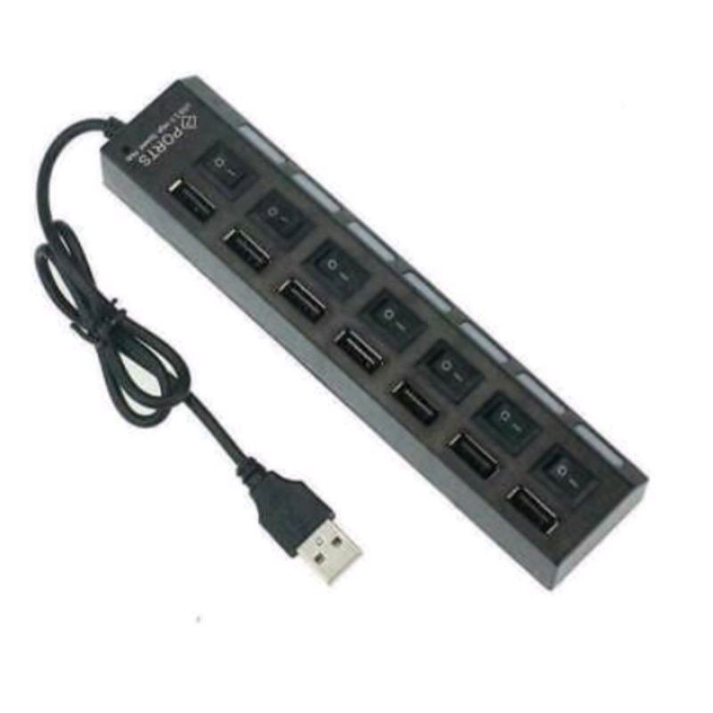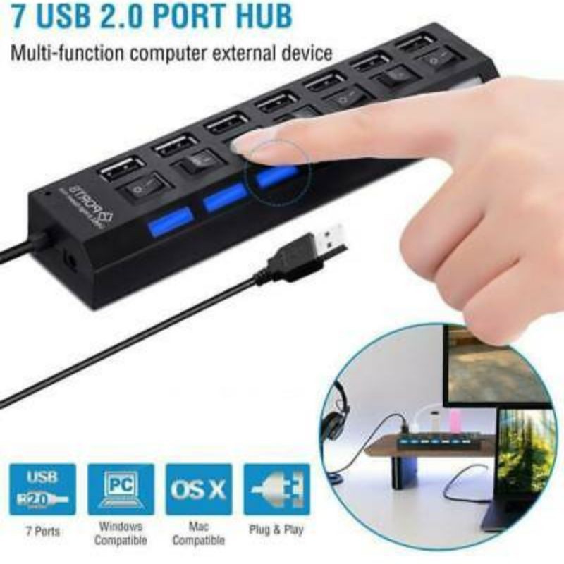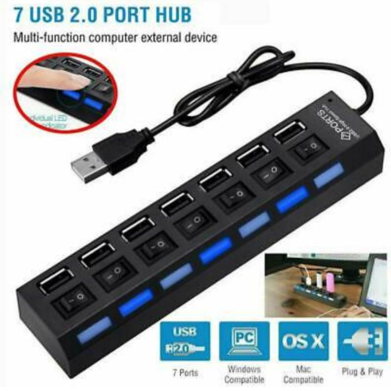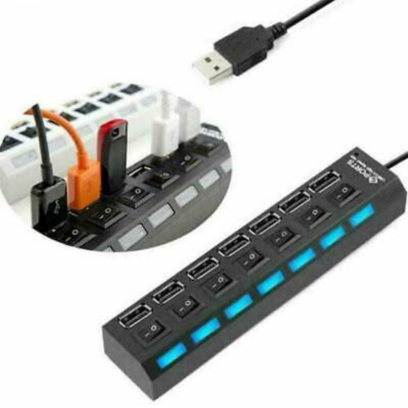 USB Hub Multi 7 Port Tombol Switch LED Indicator On Off Power Button High Speed Computer PC Laptop