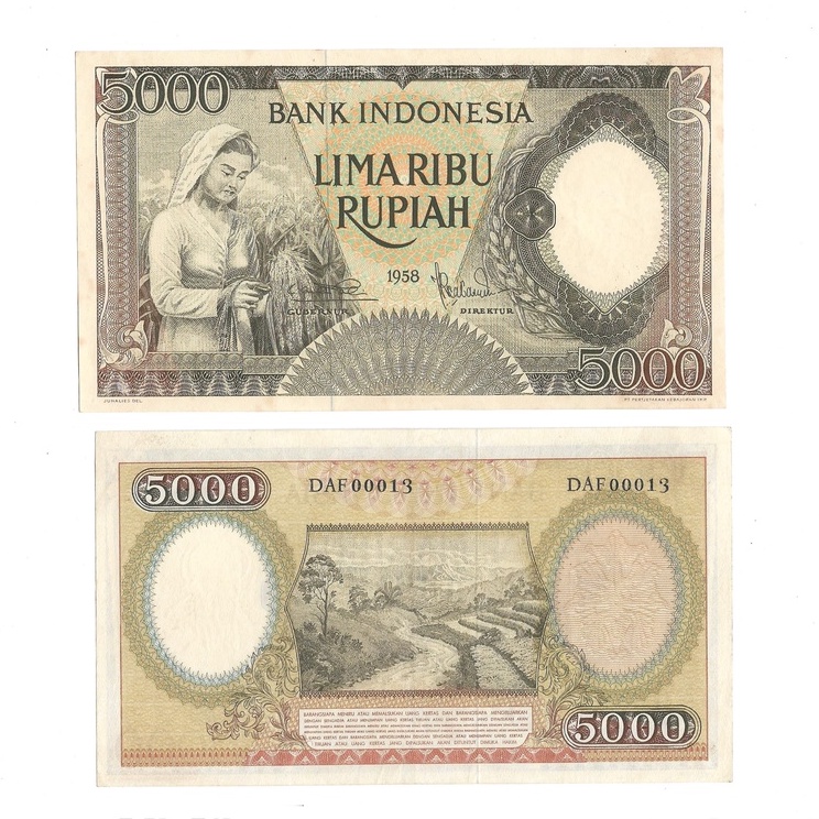 Uang kuno Indonesia 5000 Rupiah (Coklat) 1958 Seri Pekerja Tangan I Very Fine & Extra Fine