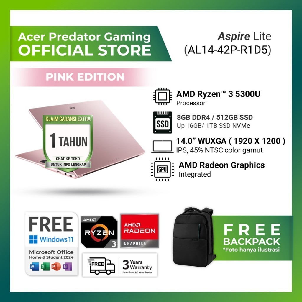 [Pink Edition] Acer Aspire Lite 14 AL14-42P-R1D5 - AMD Ryzen 3 5300 16GB 512GB Windows 11 + Office 14.0 inch WUXGA
