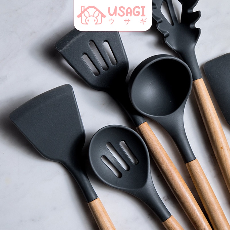 Usagi - Food Grade Wooden Silicone Spatula Turner Brush Whisk Spoon Multi Color - Gray Sutil / Sodet Tevlon Pancake Silicon Silikon Masak Perlengkapan Dapur Kitchen Set Abu Abu Gagang Kayu