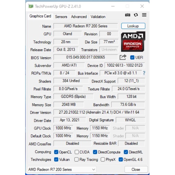 VGA AMD Radeon R7 250 2GB GDDR5 Fullset 128Bit