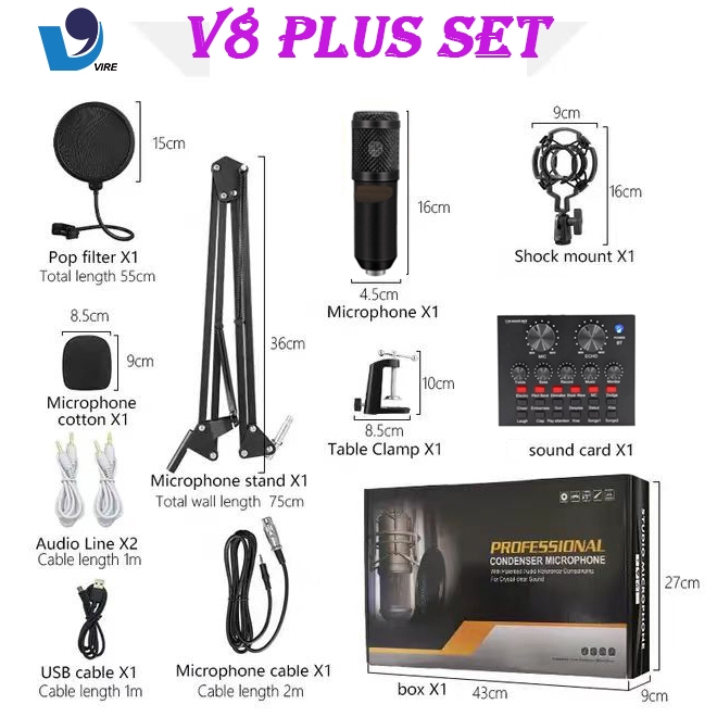 VIRE Sound Card Bluetooth V8 PLUS SET/V9 Live Mixer Audio USB External Broadcast MIXIO - BM800 Microphone
