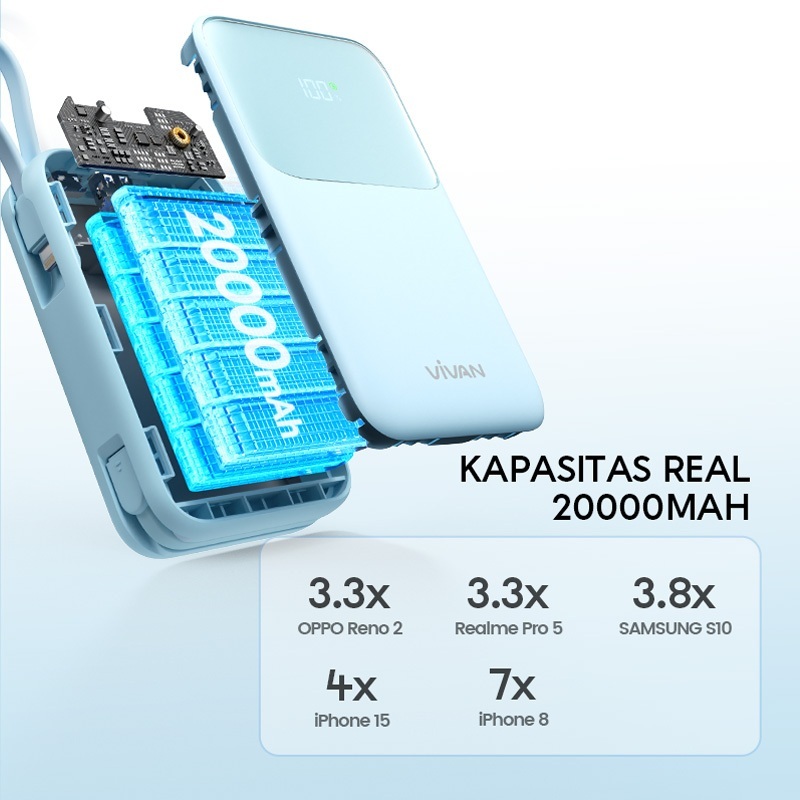VIVAN Power Bank VPB-P20 Powerbank 20000mAh LED Dual Ouput 2 Built In Cable Type-C & Lightning Fast Charging 22.5W PD QC3.0 Original Resmi