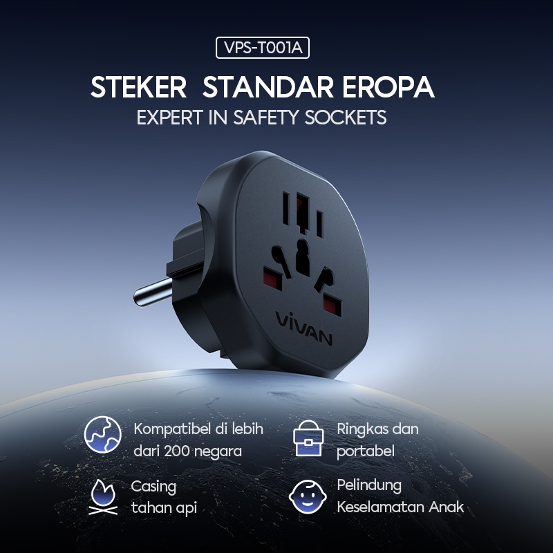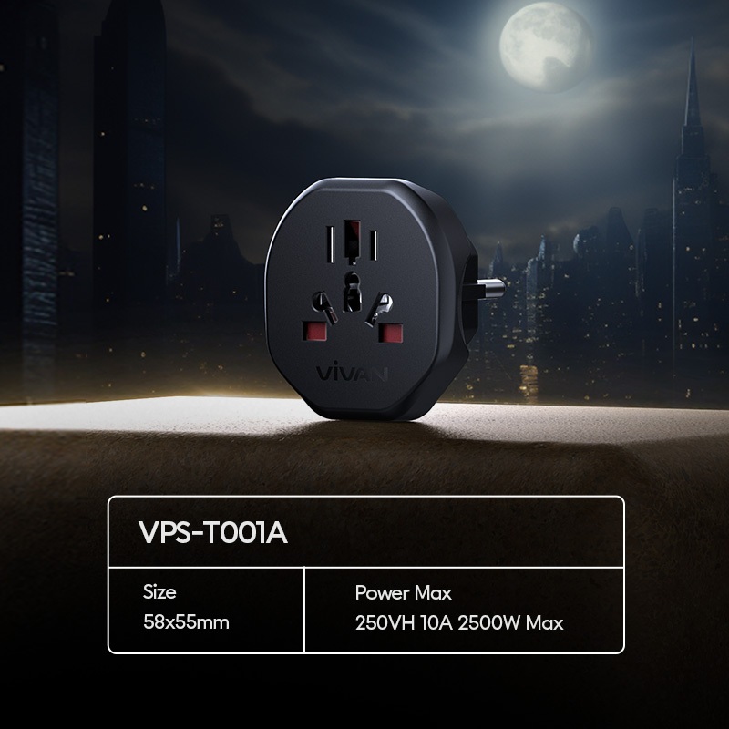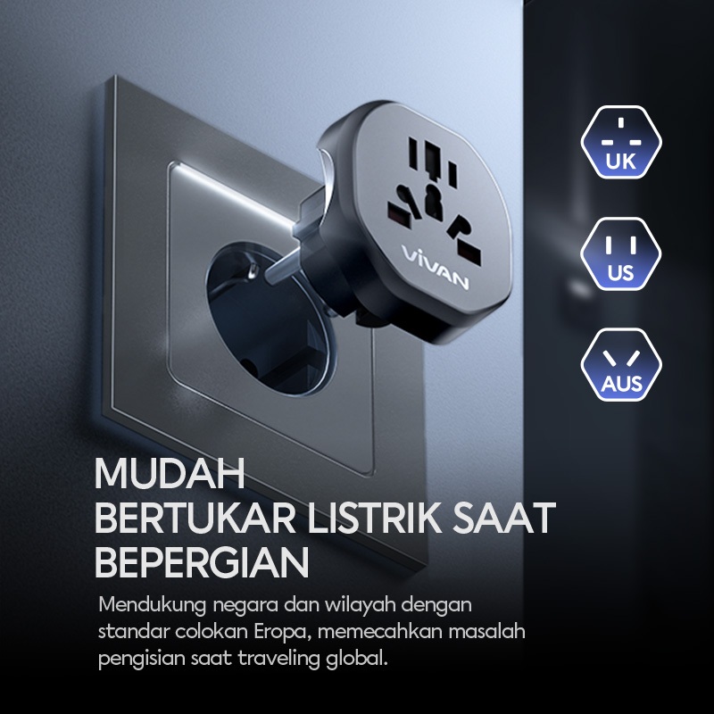 VIVAN Travel Adaptor VPS-T001A 2W/20W/25W/45W/65W/70W/75W Multi-country / Power Adapter Universal / Colokan Listrik Fast Charging / Steker Socket Portable Standar Internasional Black Original - Garansi Resmi 36 Bulan