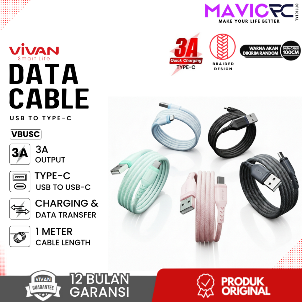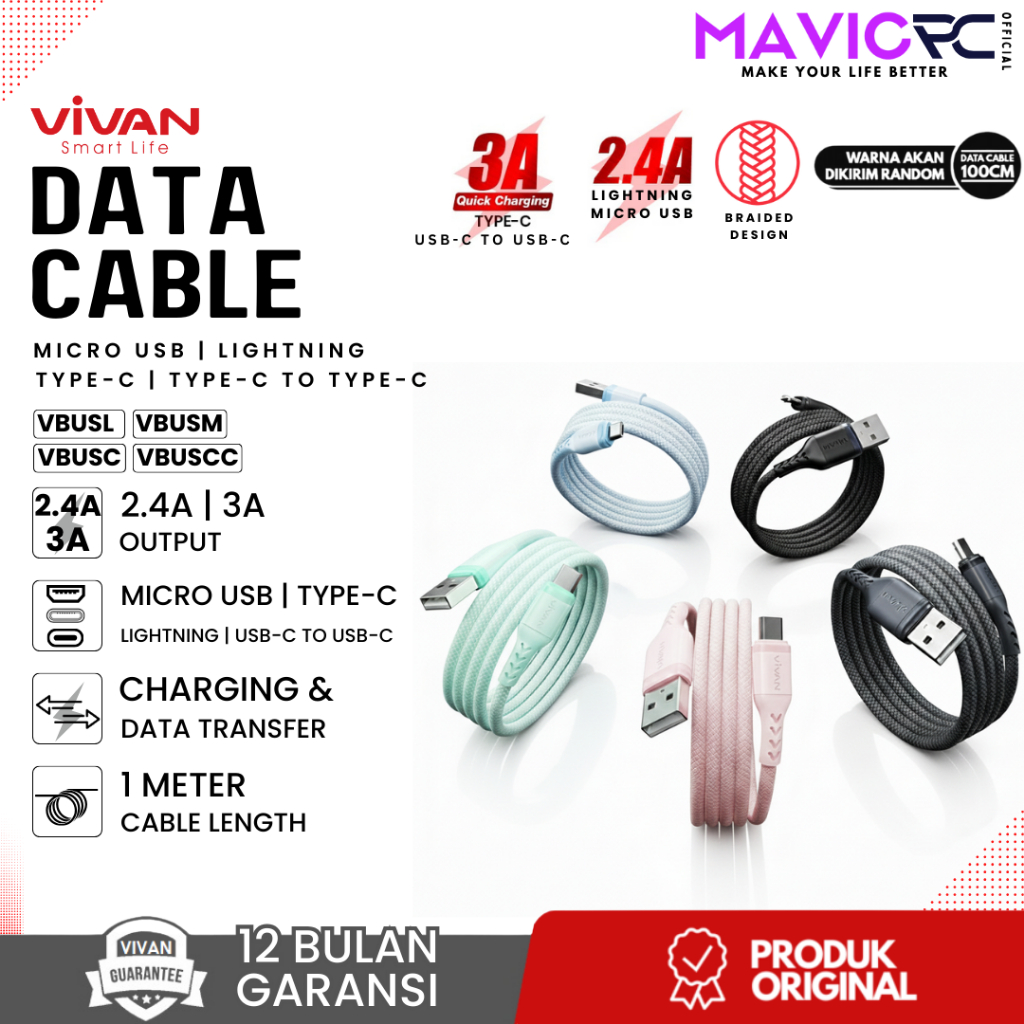 [PER PCS] VIVAN BUS Kabel Data Cable Toples Kaleng 1M VBUSCC USB-C to USB-C / VBUSC Type C / VBUSL Lightning / VBUSM Micro USB | 1 Meter 3A/2.4A - Garansi Resmi 1 Tahun