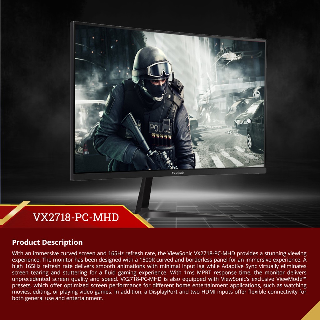 ViewSonic VX2718-PC-MHD 27” Curved Gaming Monitor | 165Hz | 1ms | 1500R | HDMI | FHD 1080p
