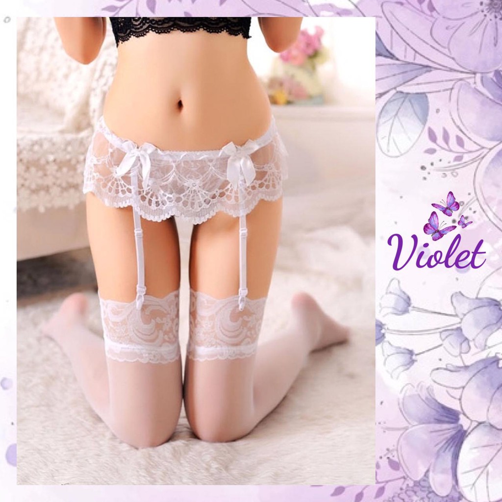 Violet Stocking Seksi Set + G-String Celana Dalam Wanita Renda With Garter Belt Erotis 1088