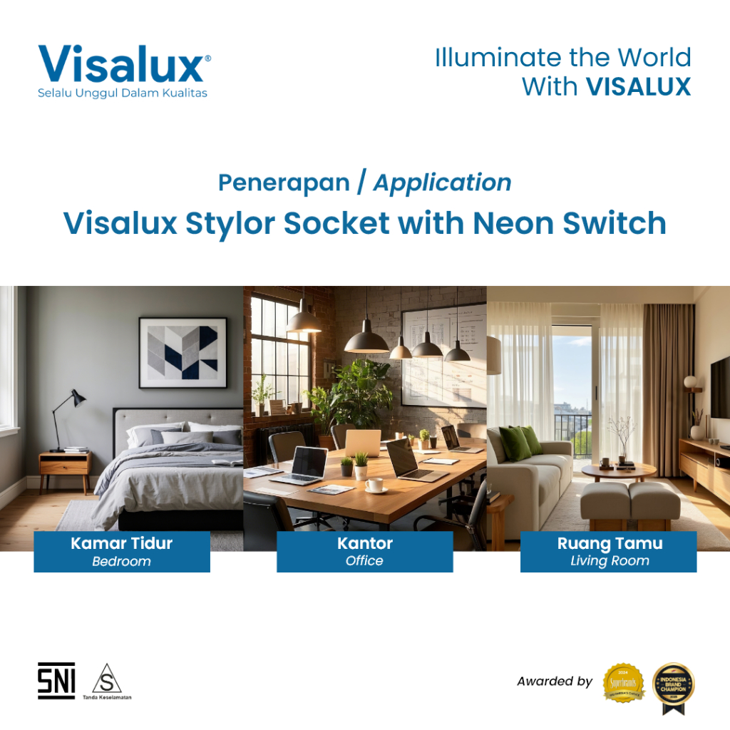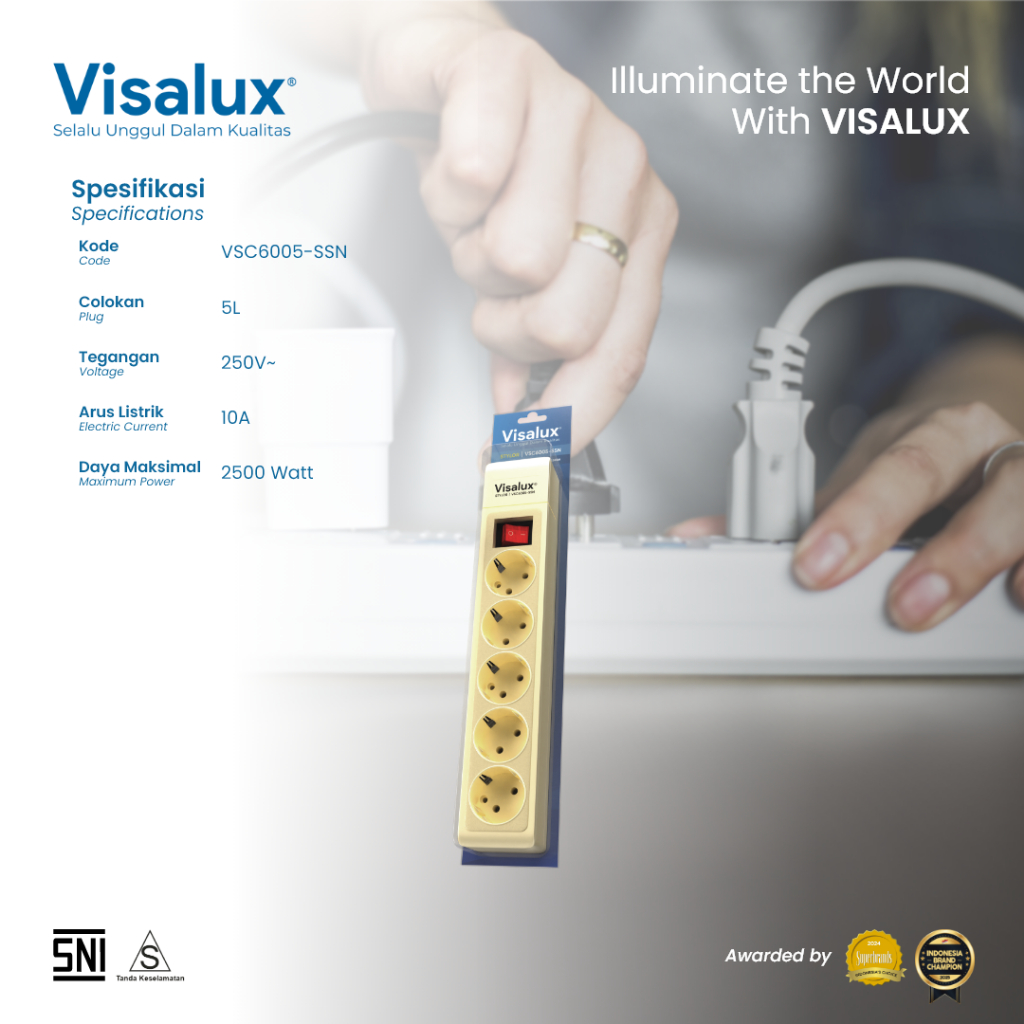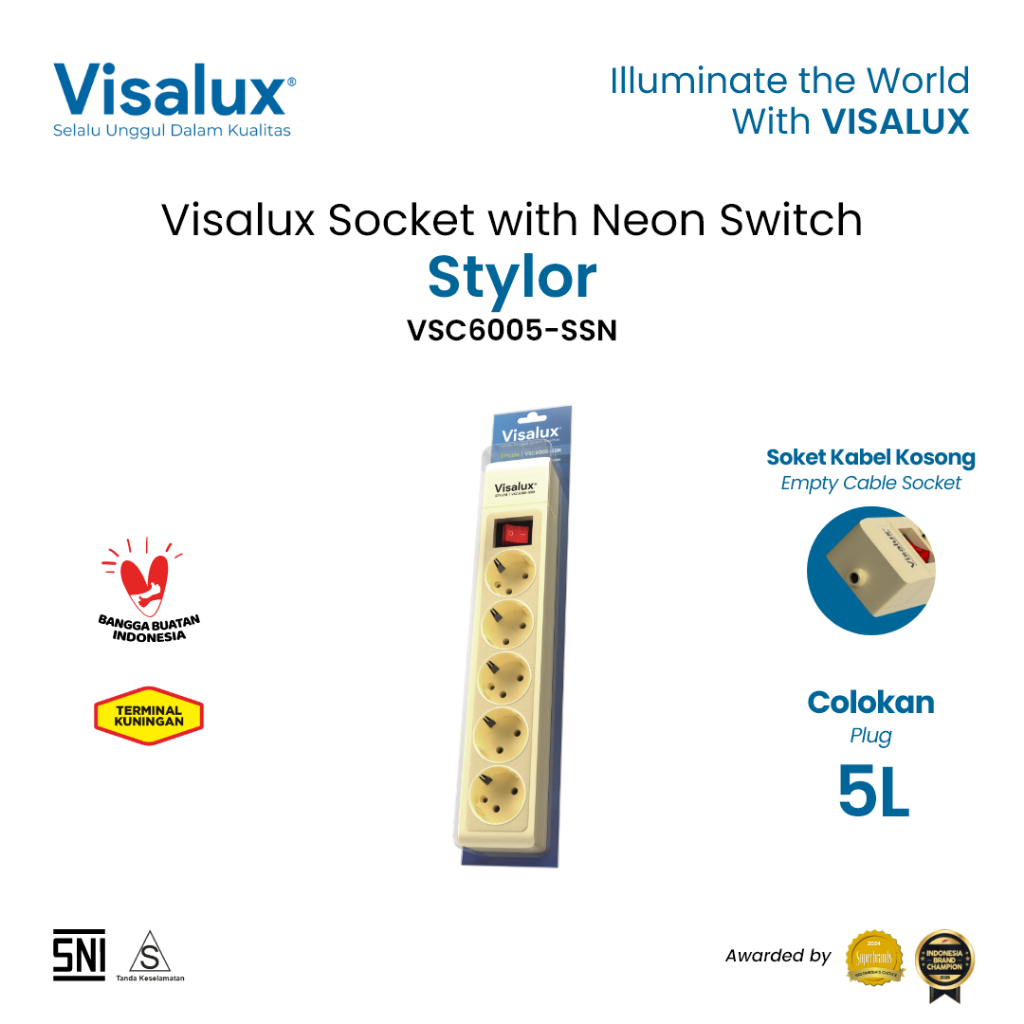 Visalux Stylor Socket with Neon Switch - 5L (Soket Kabel Kosong Stop Kontak Colokan 5 Lubang dengan Saklar Neon) (VSC6005SSN)