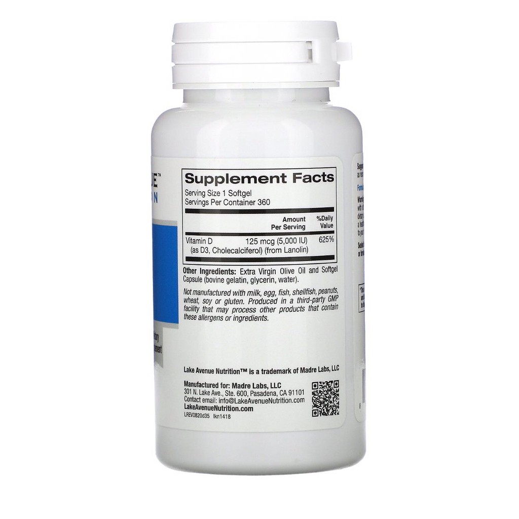 Vitamin D3 5000 iu 360 softgels Lake Avenue Nutrition Vitamin D Vit D Vit D3 5000iu Original USA
