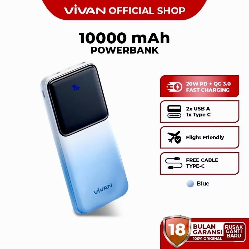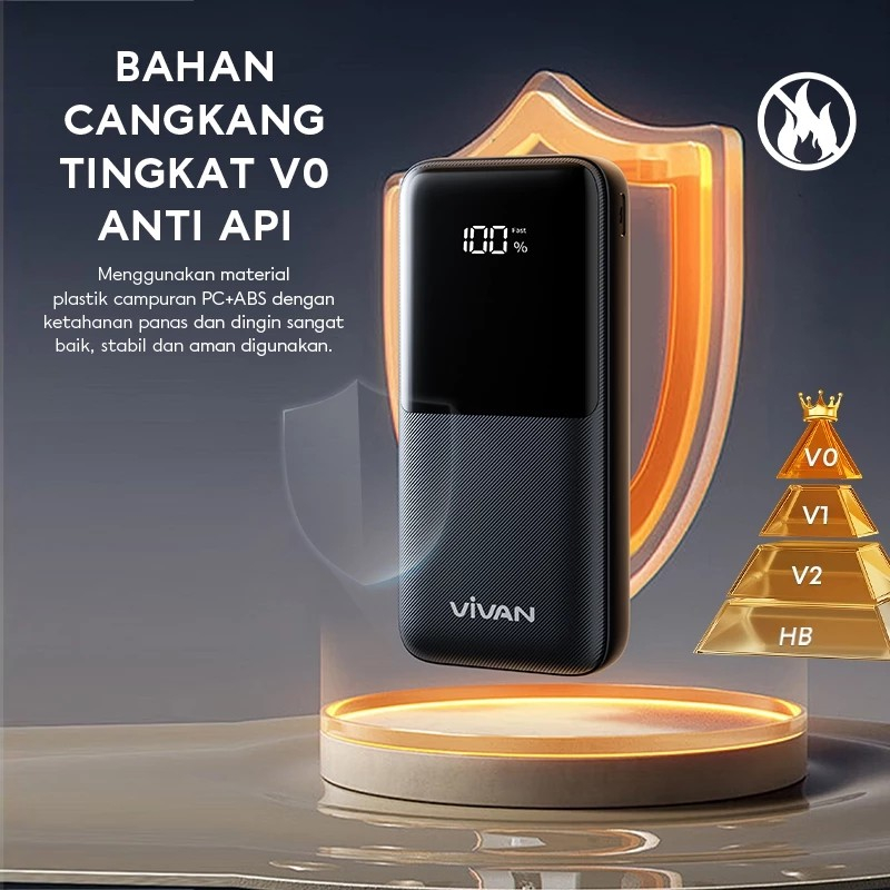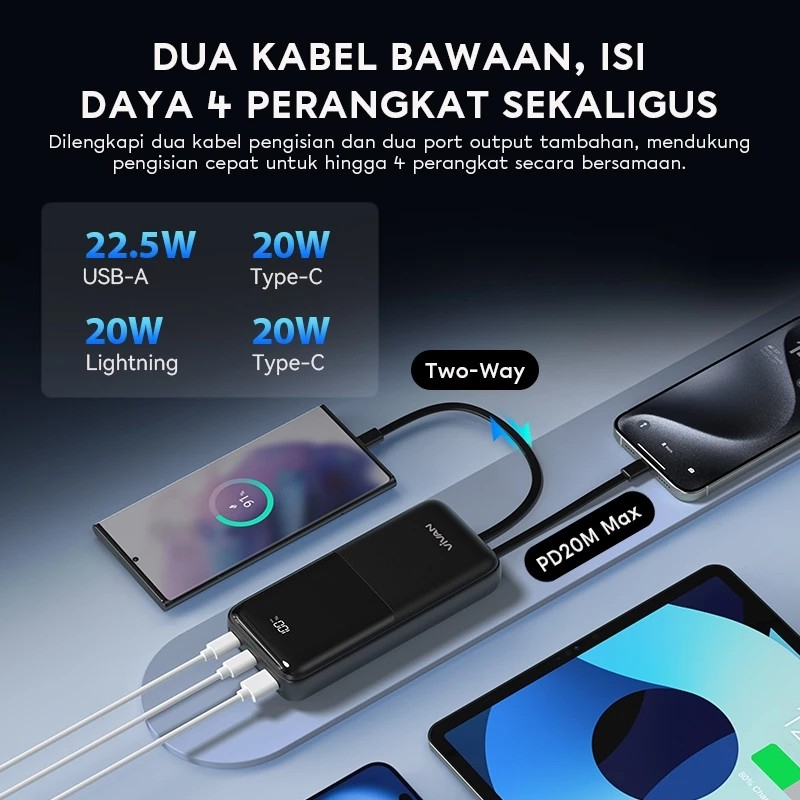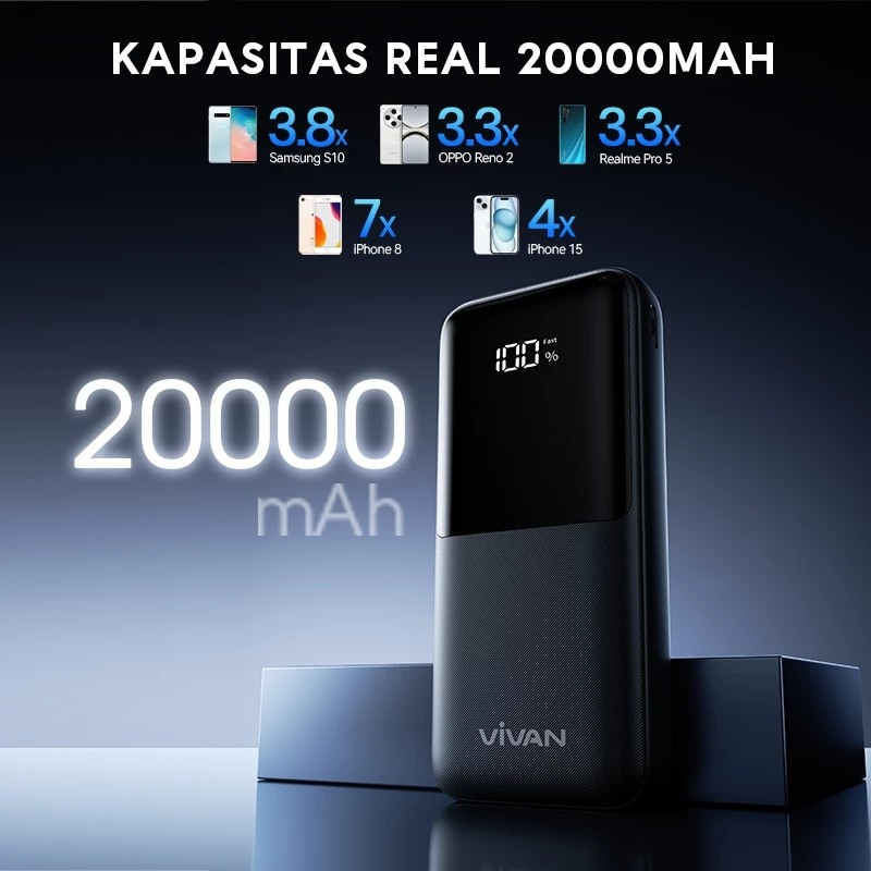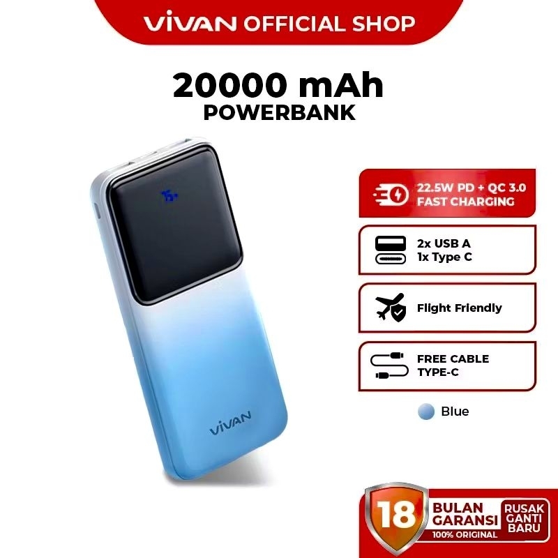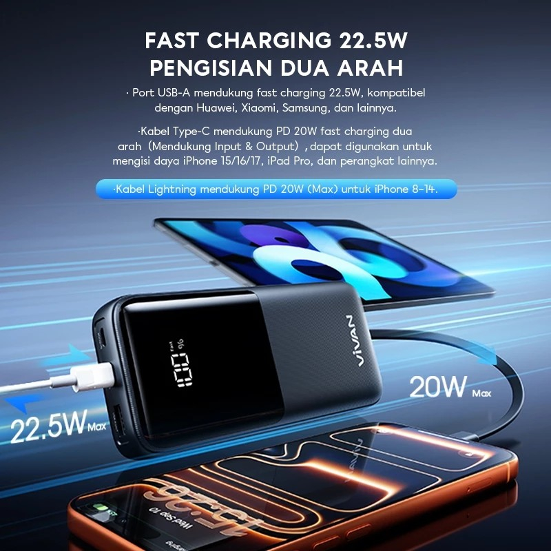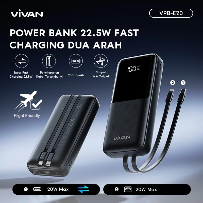 VIVAN VPB-E20 Powerbank 20000mAh Fast Charging 22.5W PD LED Display 4 Output Free Kabel Type-C Lightning